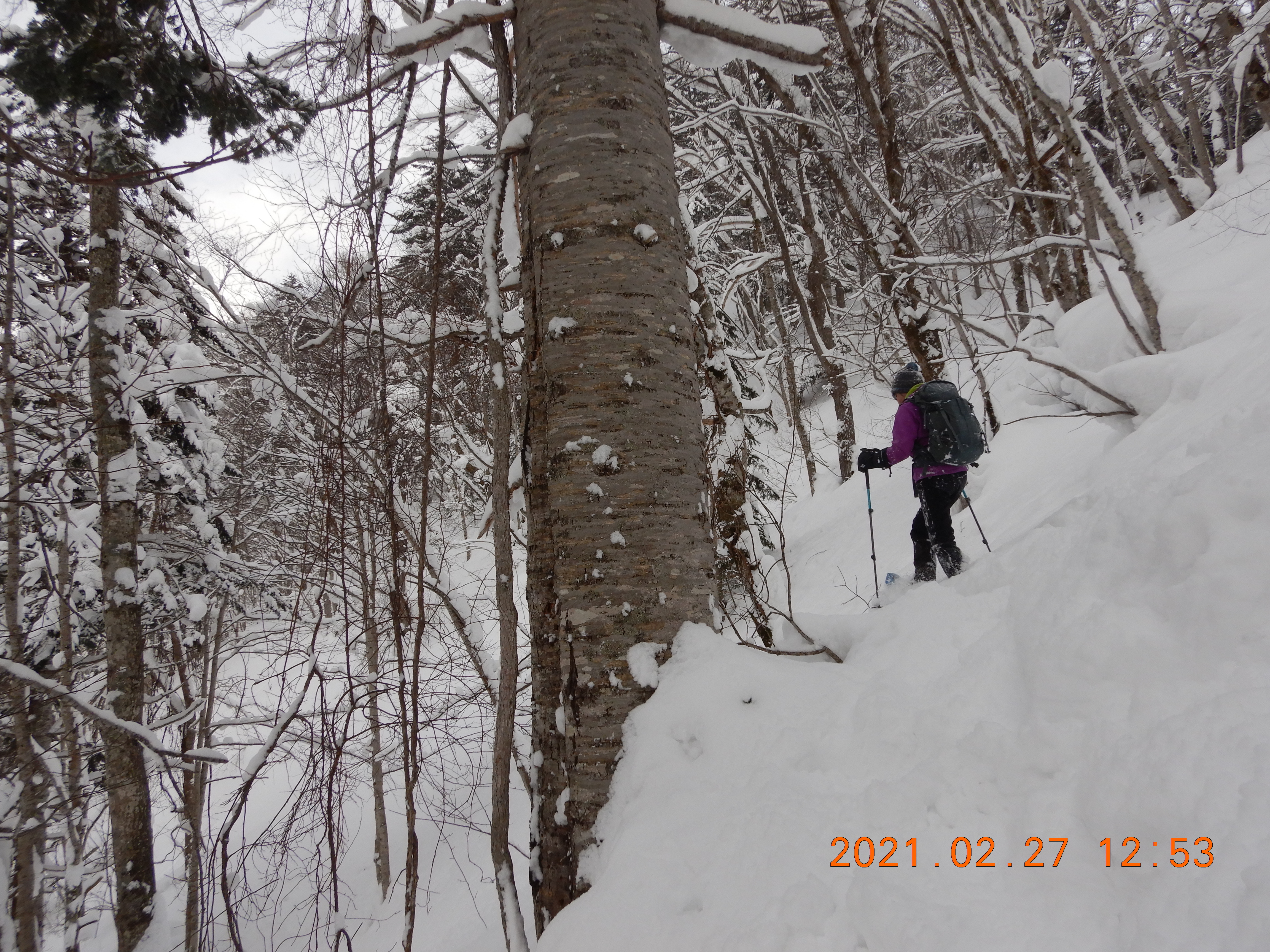 尾根に取りついたら地形図に記載無い岩峰 雪庇の下を微妙にトラバース。