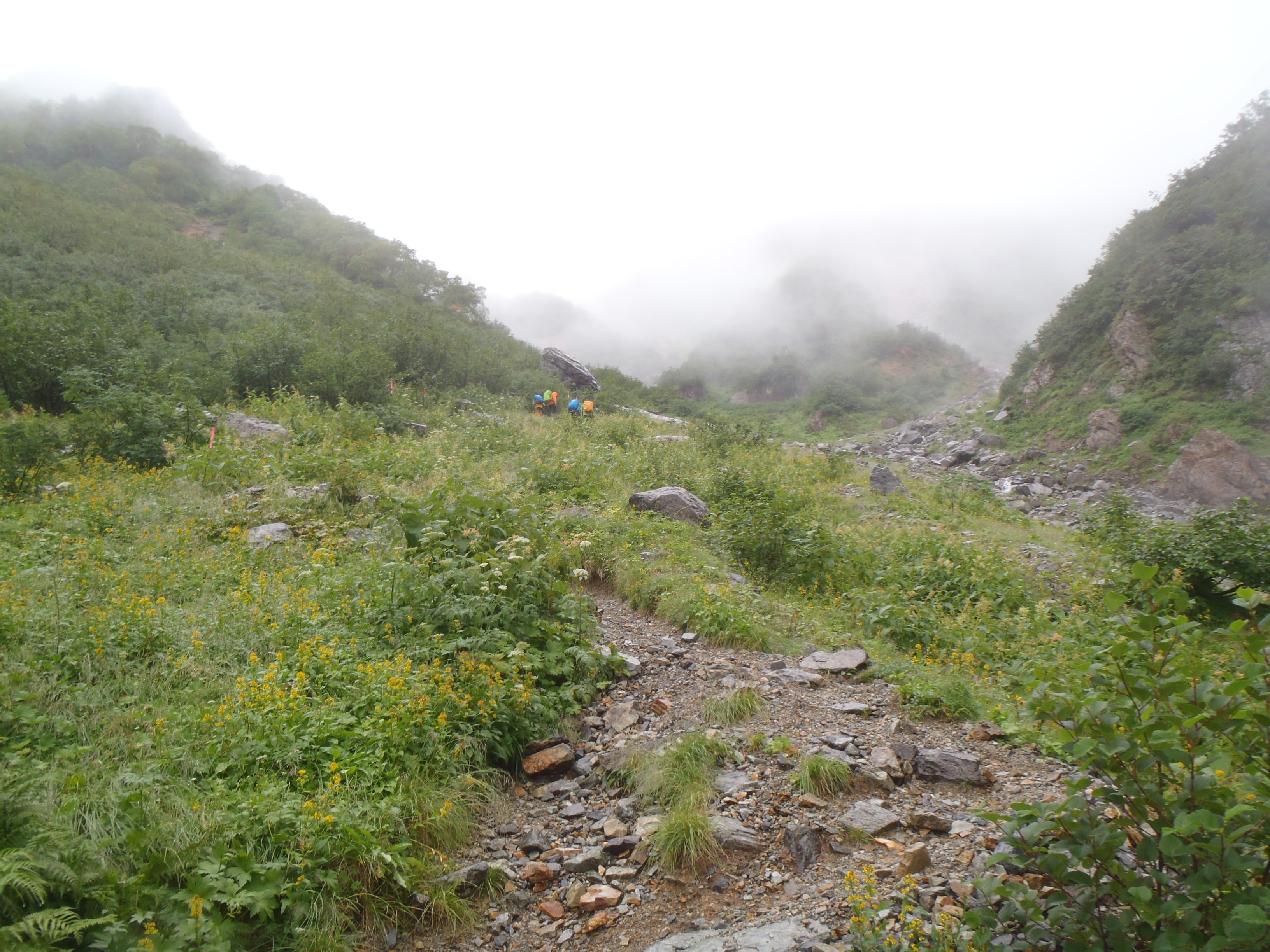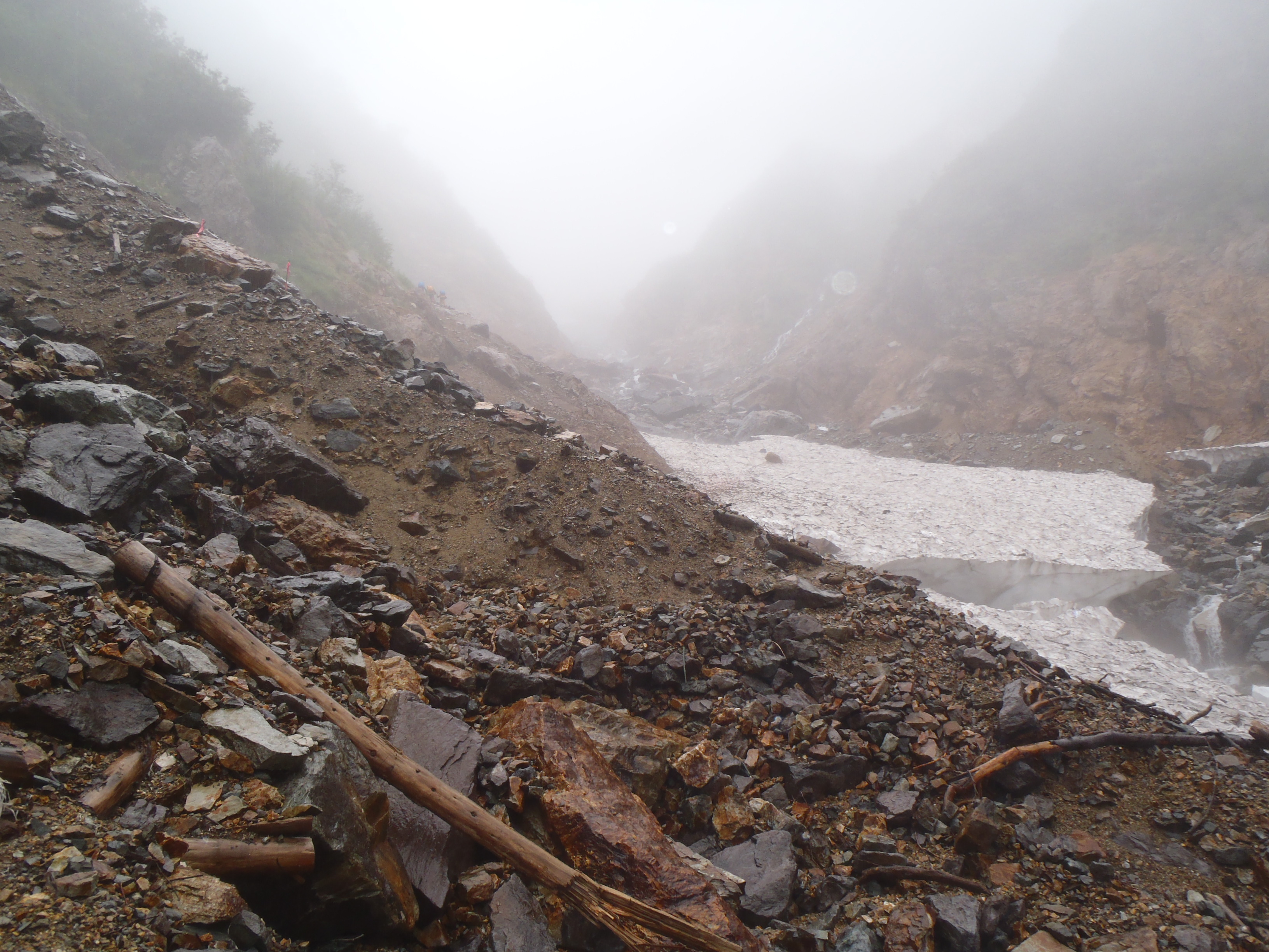 針の木雪渓は崩れていて 鎖場のある巻き道を 雨に打たれながら登りました。