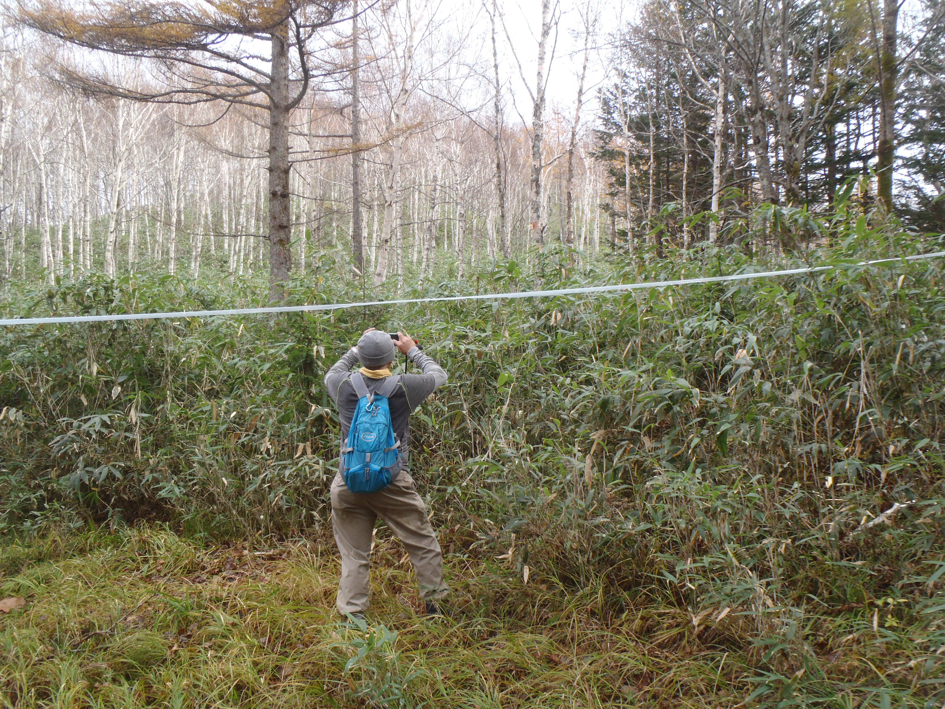 払いのけても目に突き刺さるほど濃密な藪で 捜索に利用されたと思われるテープが張り巡らされていました。