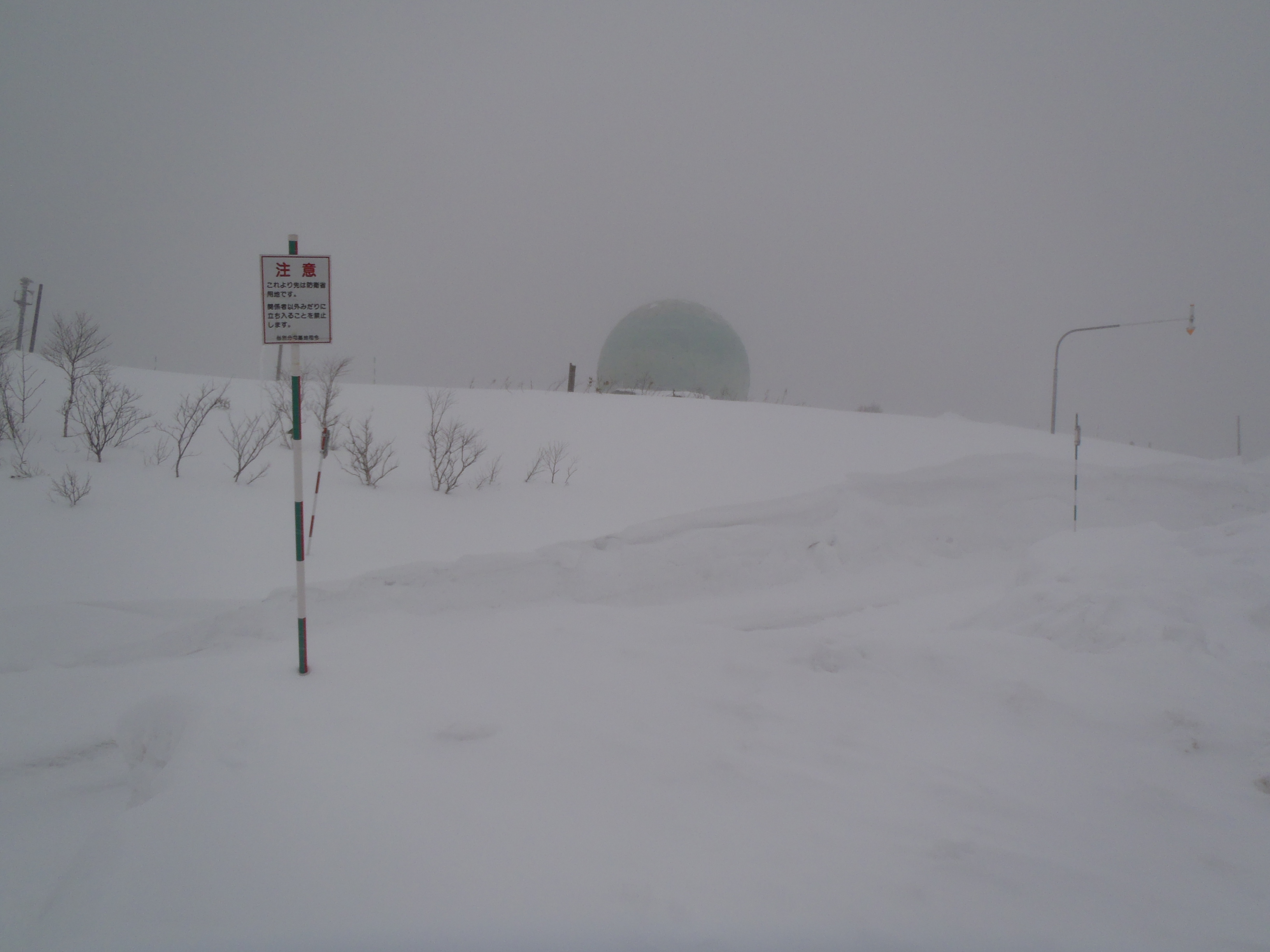 吹雪に見え隠れするレーダードームを捉え スパイのように撤退しました。