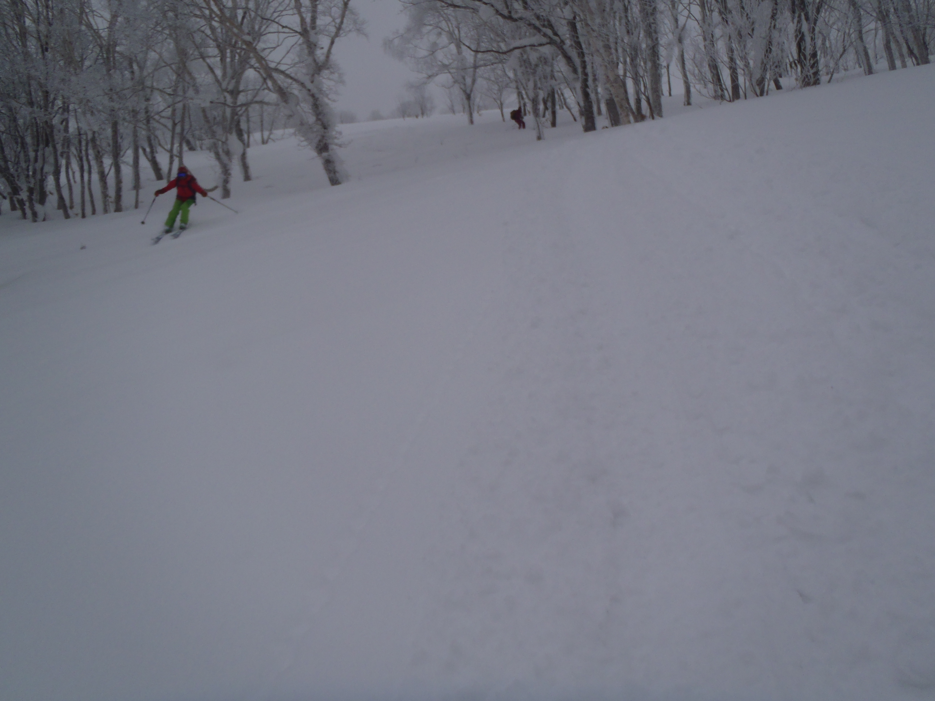 上部は風に叩かれたのか ひっかかる雪質 クライアントは大きなターンで凌いでいました。