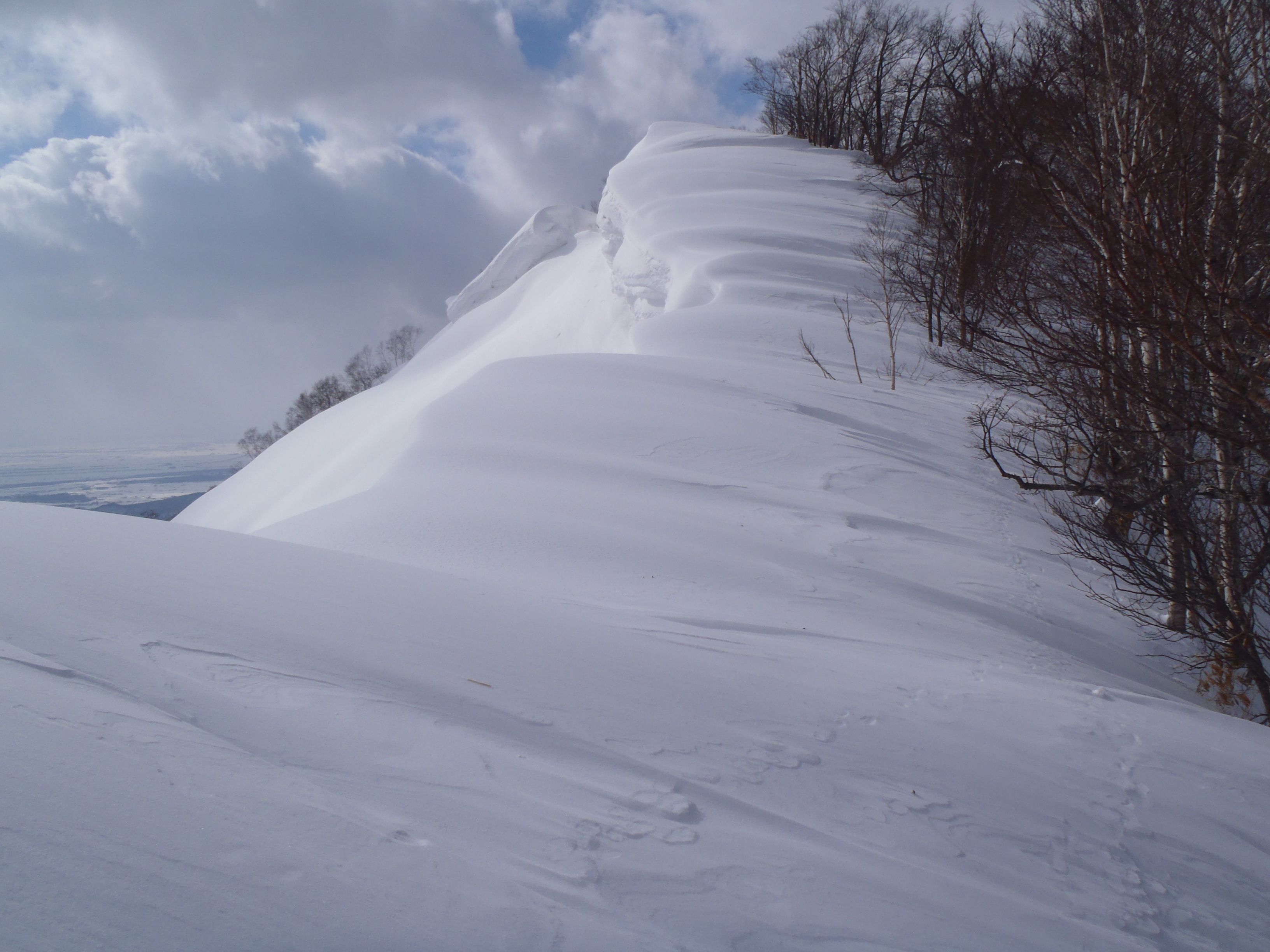 浦臼山は全層雪崩の山 巨大な雪庇も発達していて滑ってはいけない山でした。