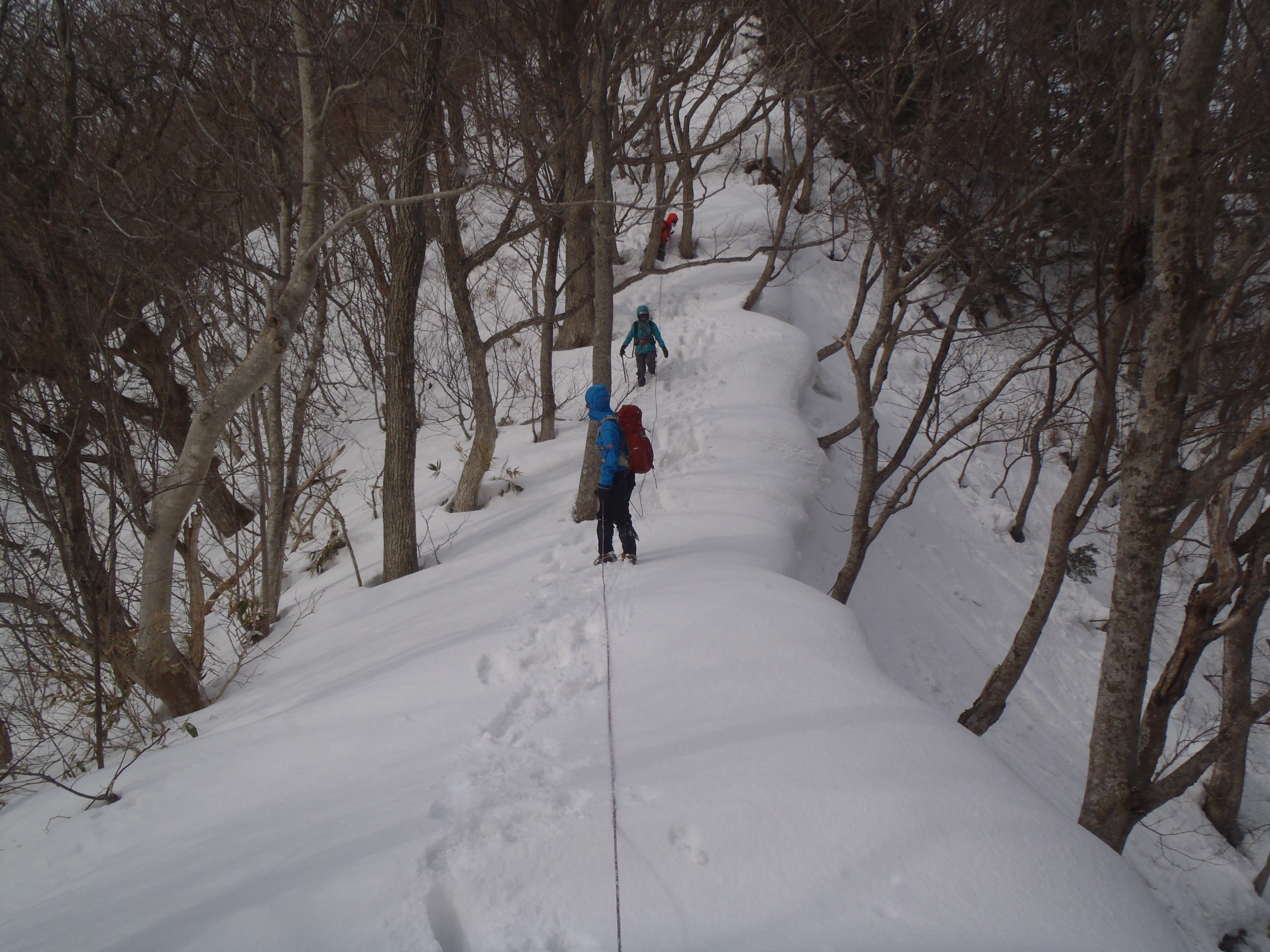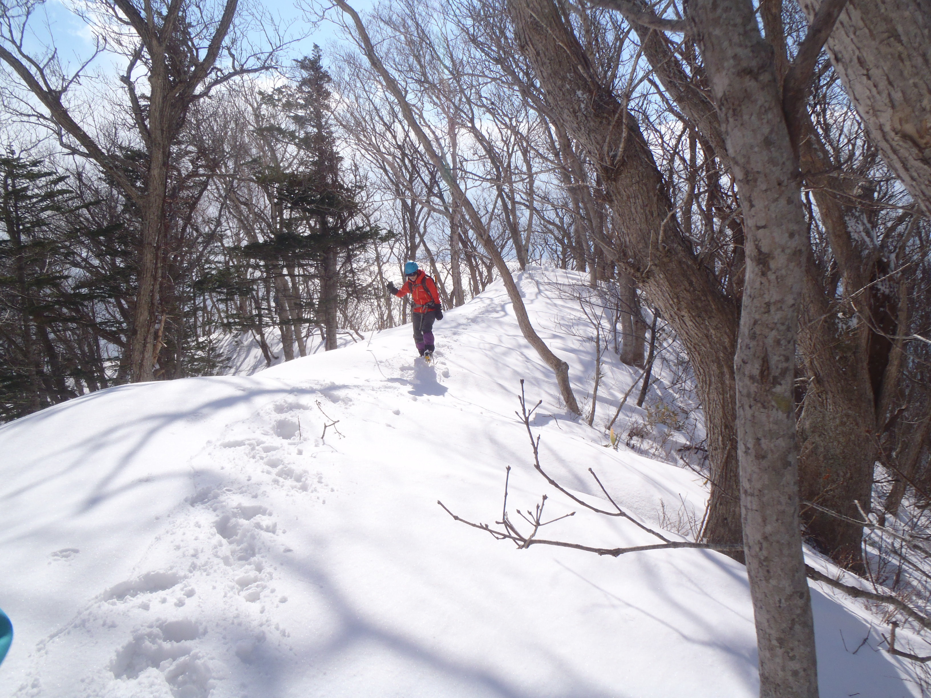 急斜面を登ったら数日前の先行者のトレースがあるので スノーシューをデポしてアイゼン着用・・・嗚呼 間違いは何度も繰り返すんだ~。