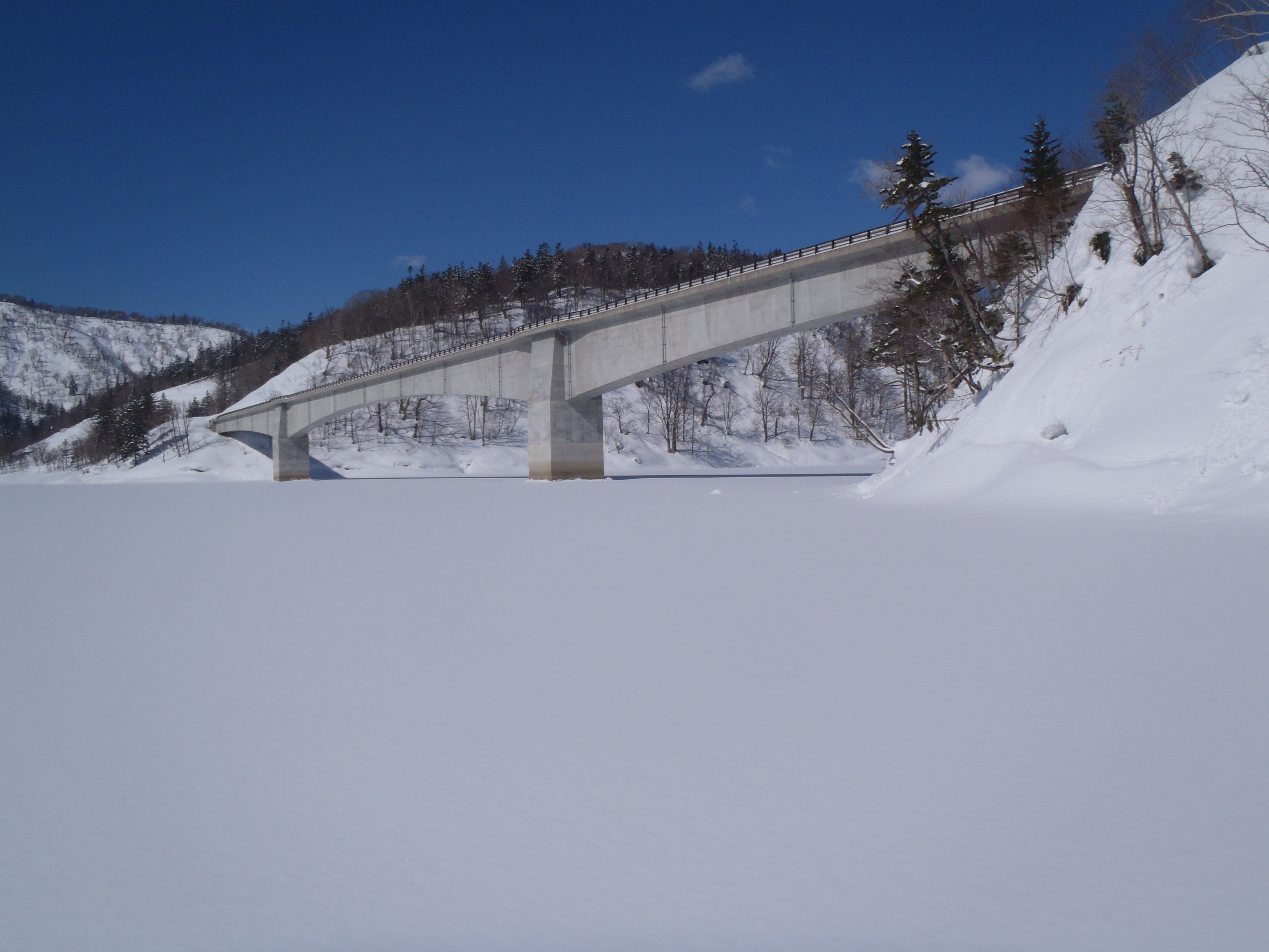 ダム湖の上流は平坦ですが 枝沢にかかるスノーブリッジが3か所 アップダウンありました。