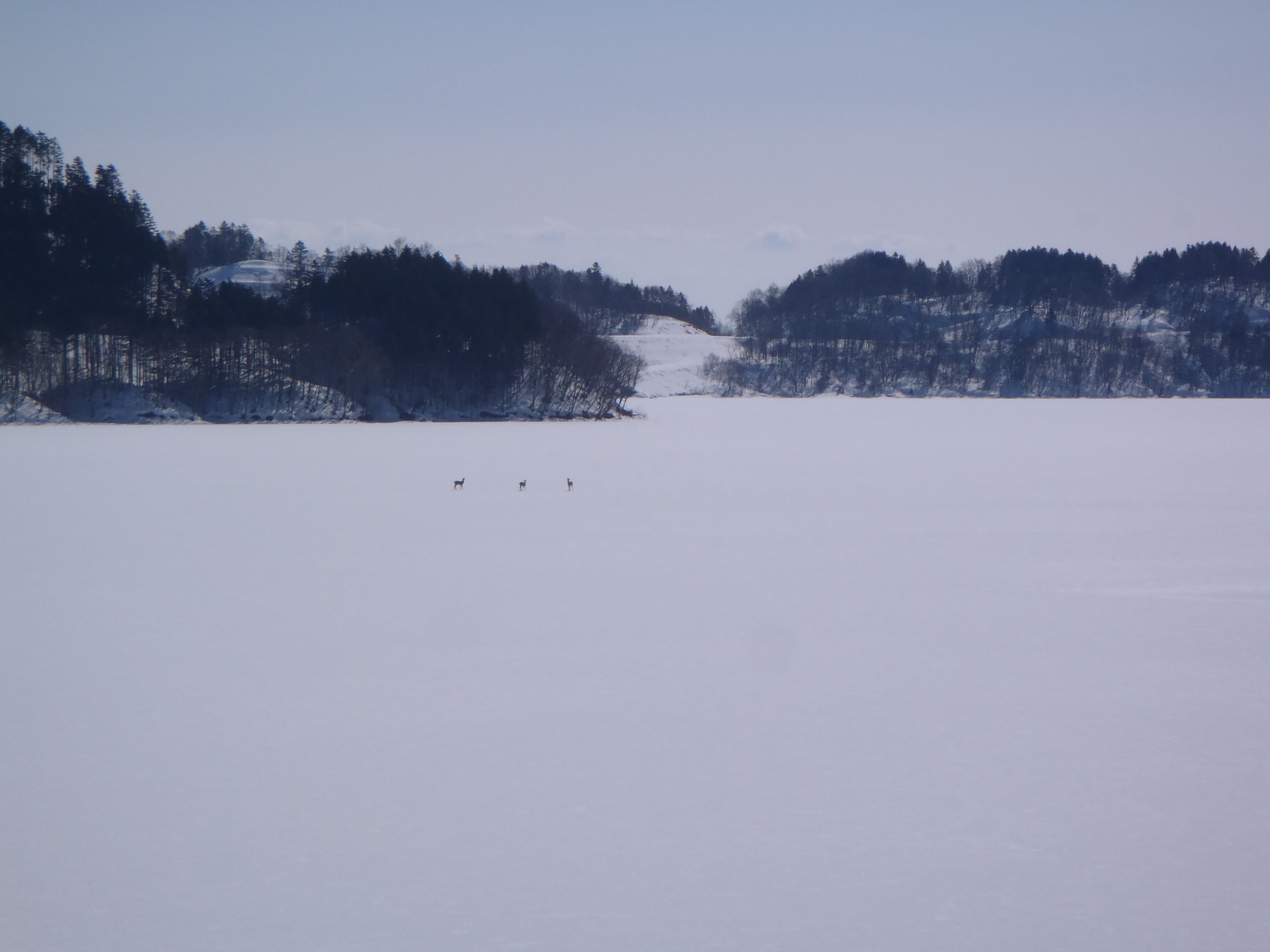 ダム湖は一面の雪原で エゾシカが3頭 優雅に散歩していました。