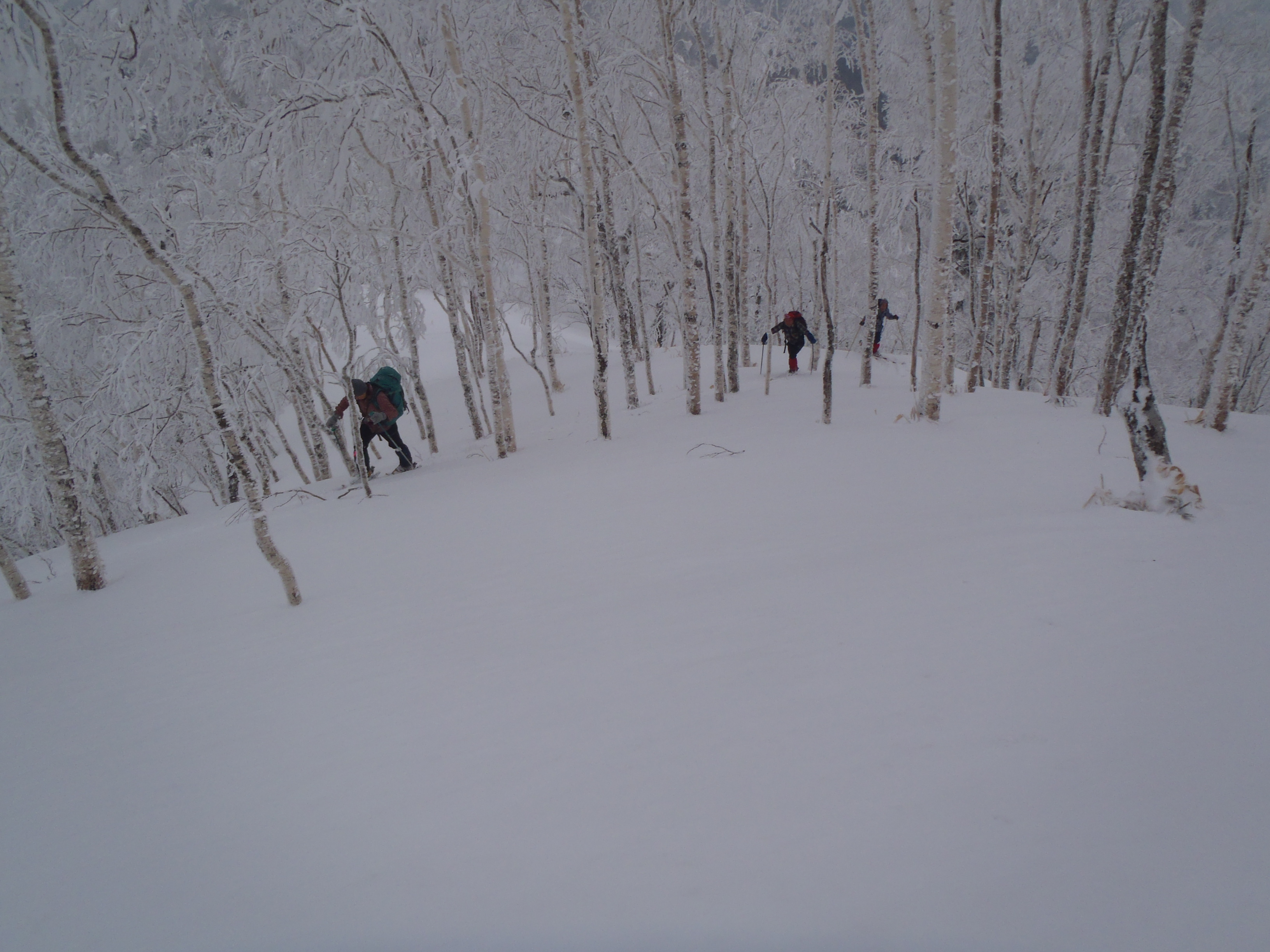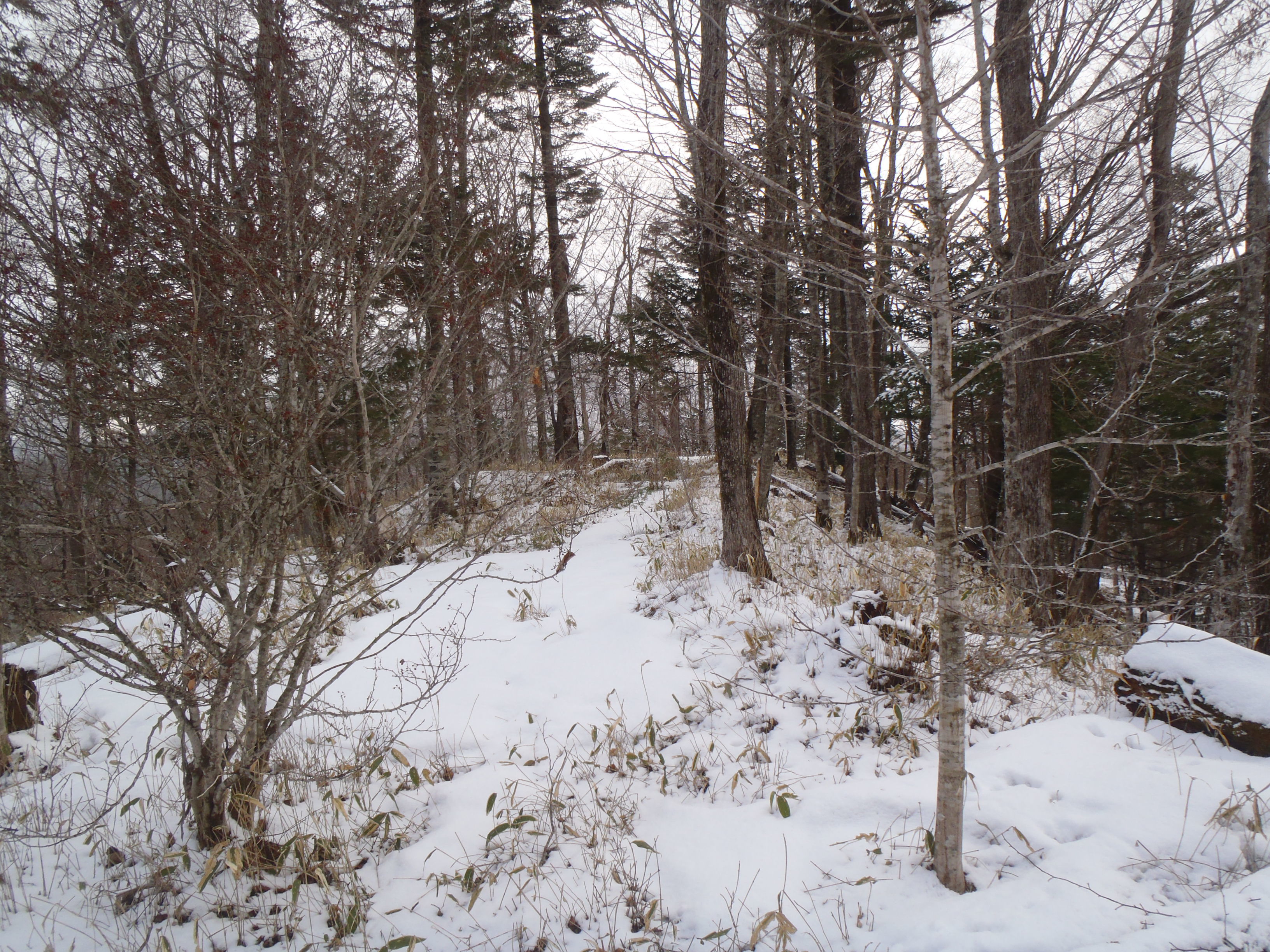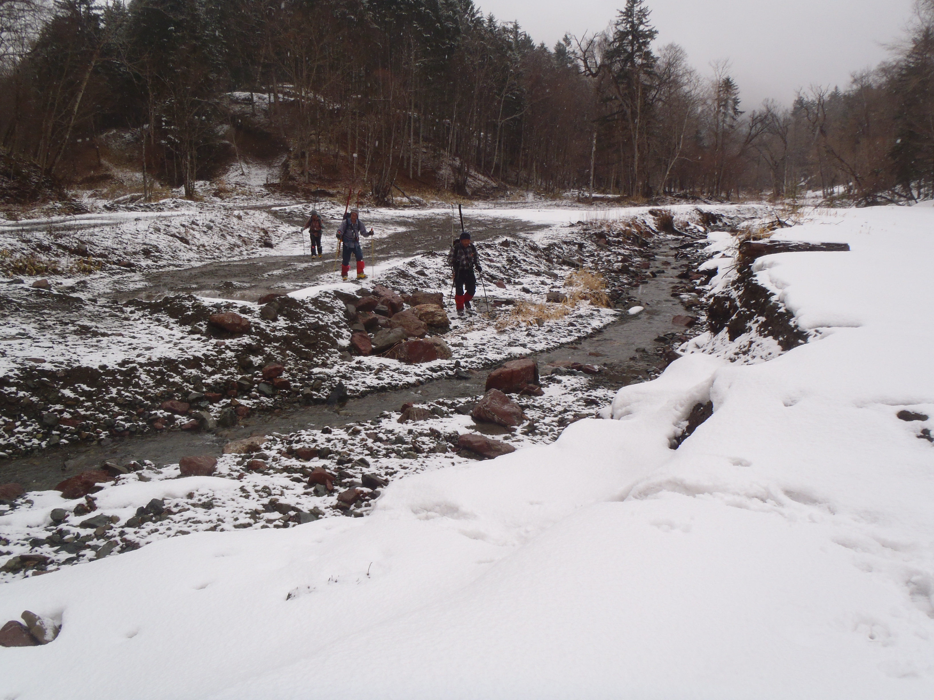 豊糠からパンケイワナイ川の登山口 標高が250m 雪がなくシートラで歩きます。