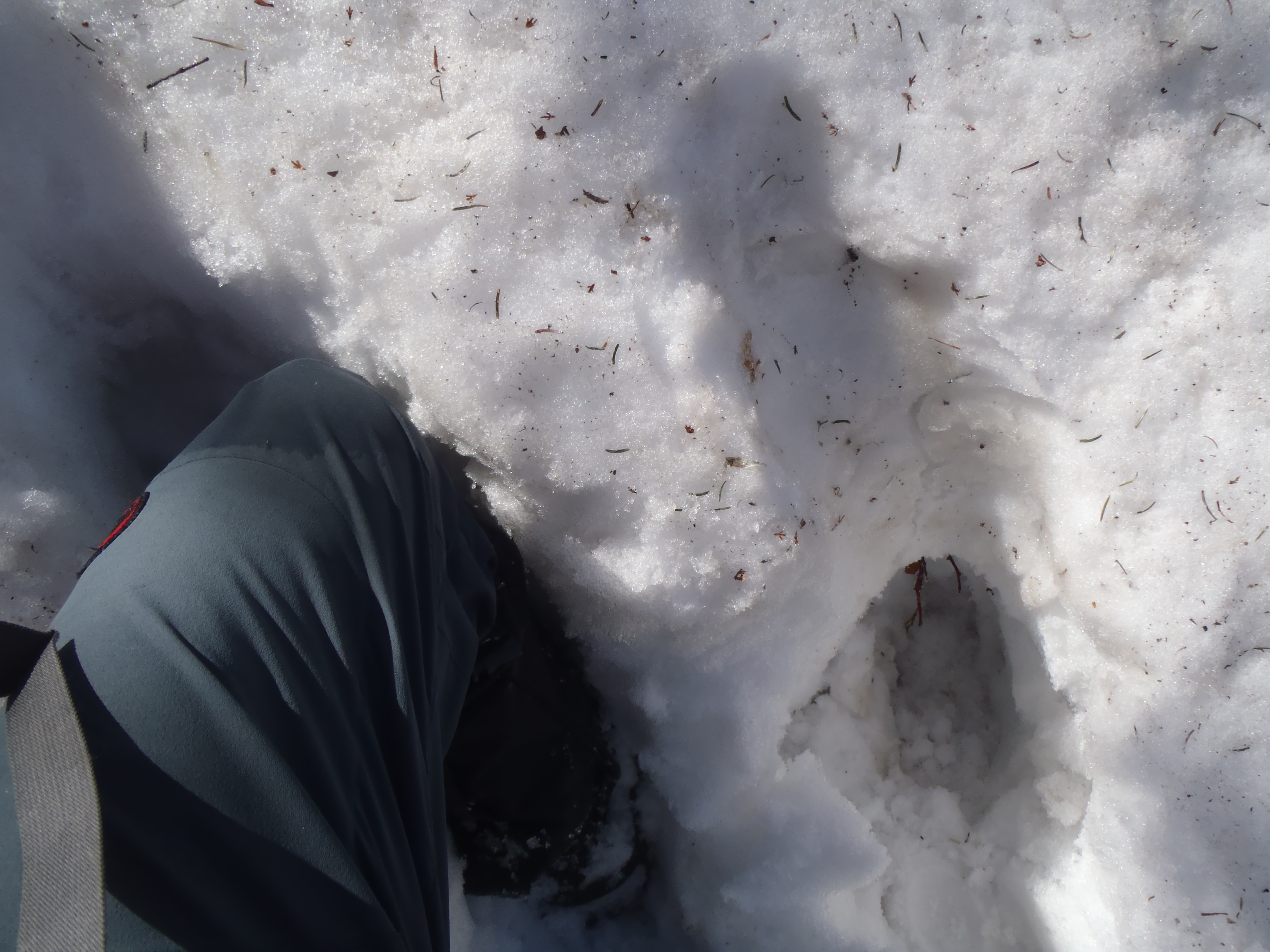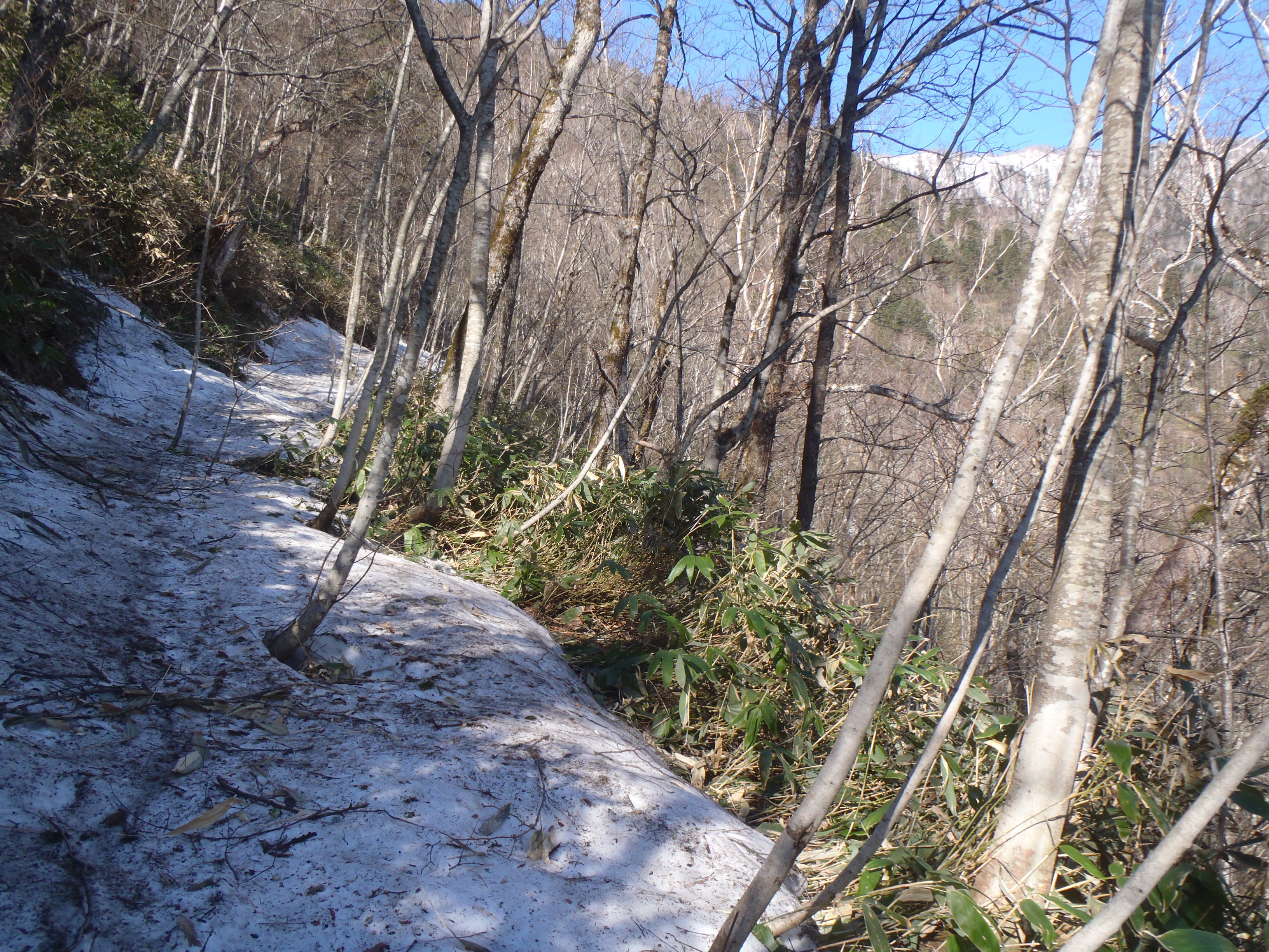 1km進んで雪の無い沢を諦め 笹薮の急斜面に取りつくと やっと作業道跡に雪が残っていました。