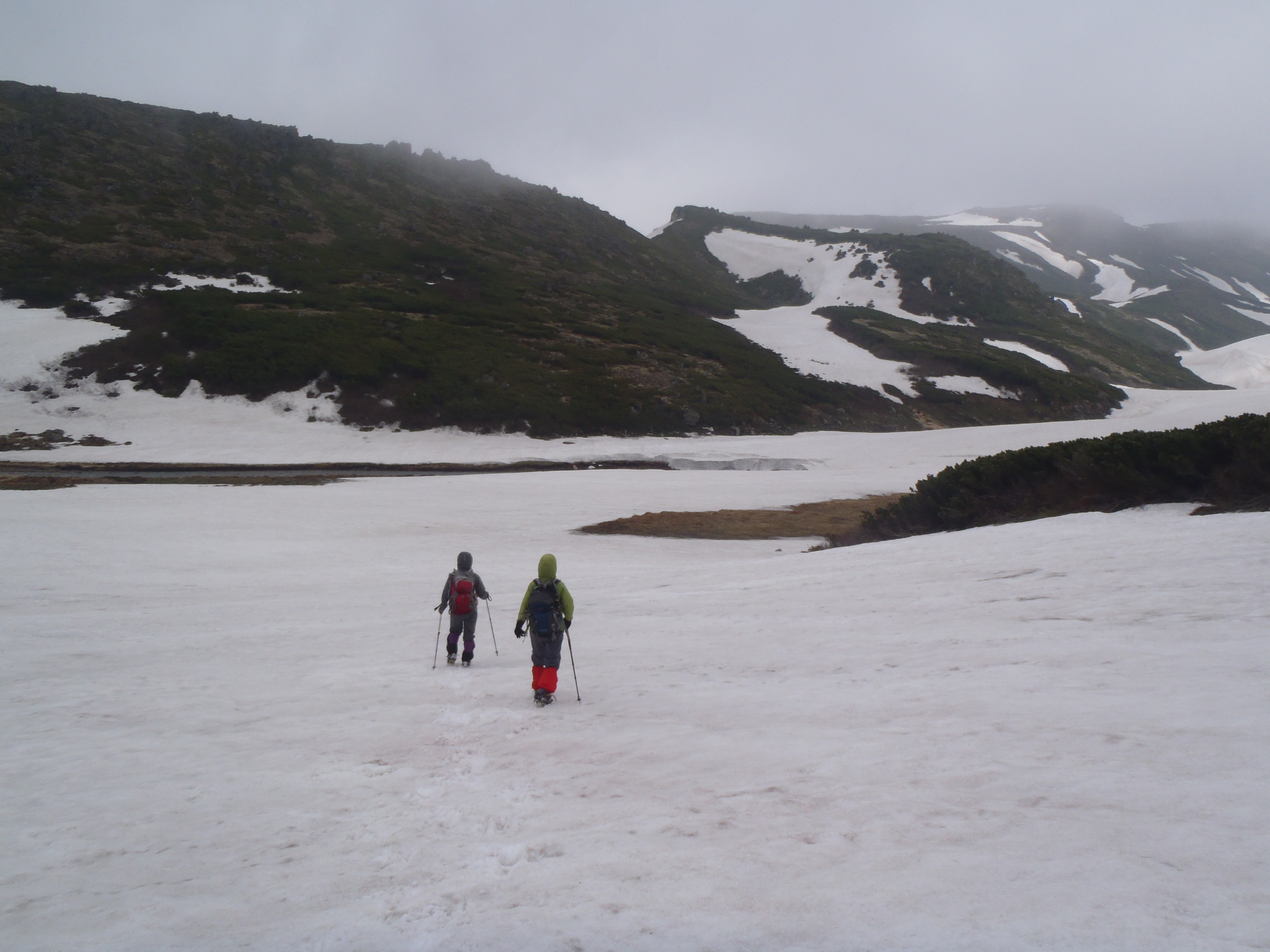 残雪を繋いで ハイ松を避けて 最短距離で渡河作戦 ルートファインディングは難しいんです。
