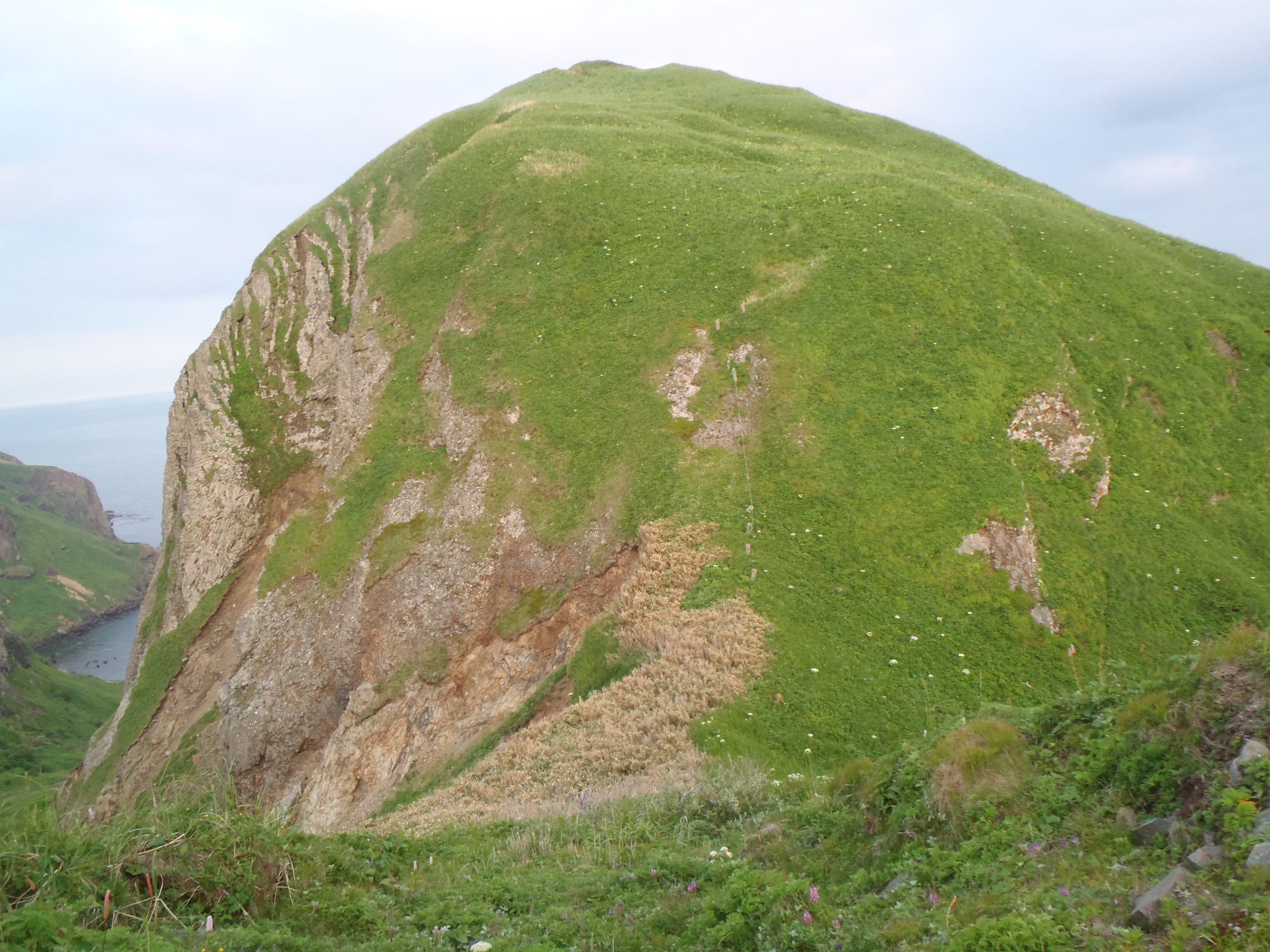 白っぽい岩場は石灰岩みたいで 古いコンクリート階段と固定ロープがありました。