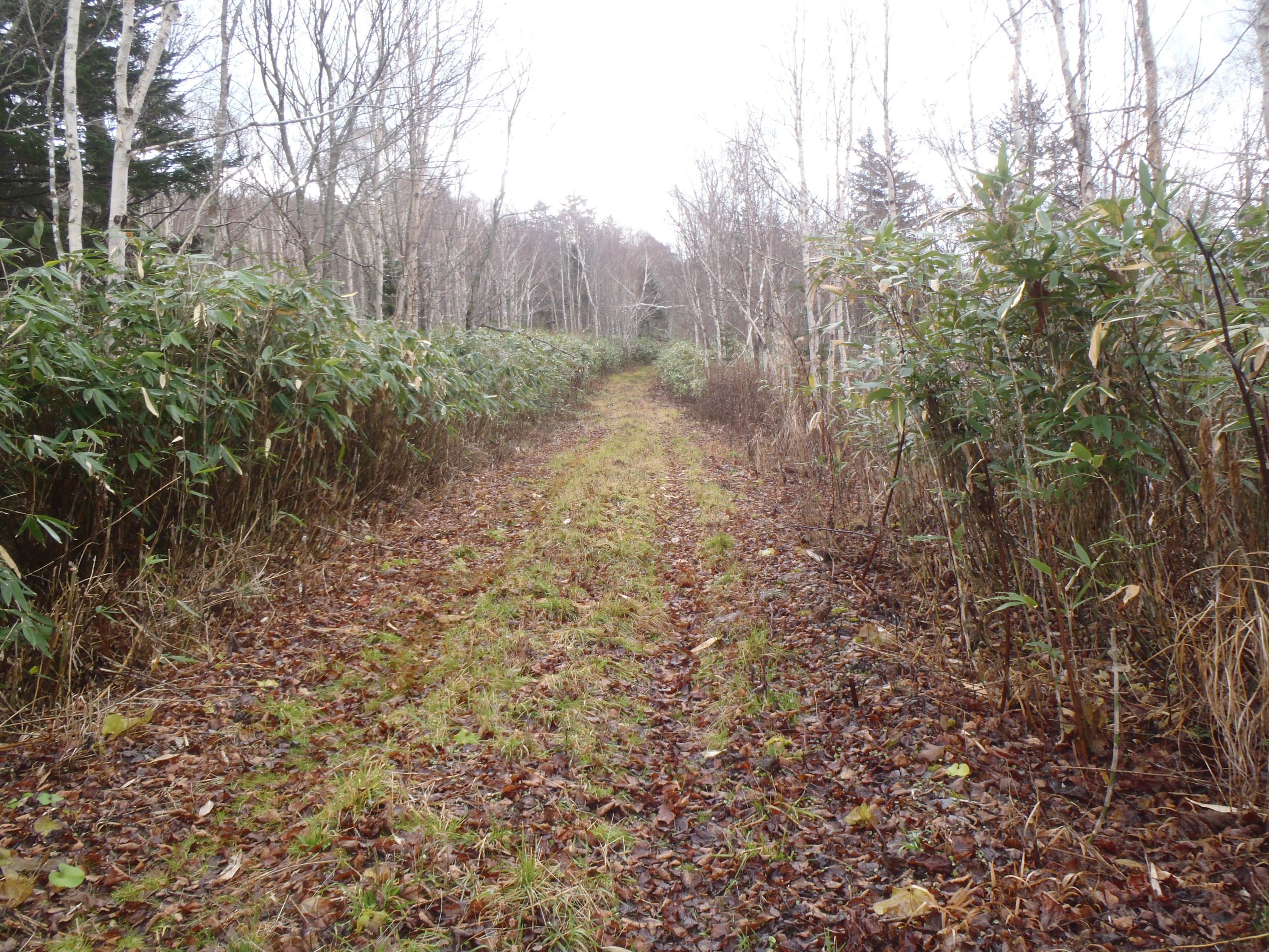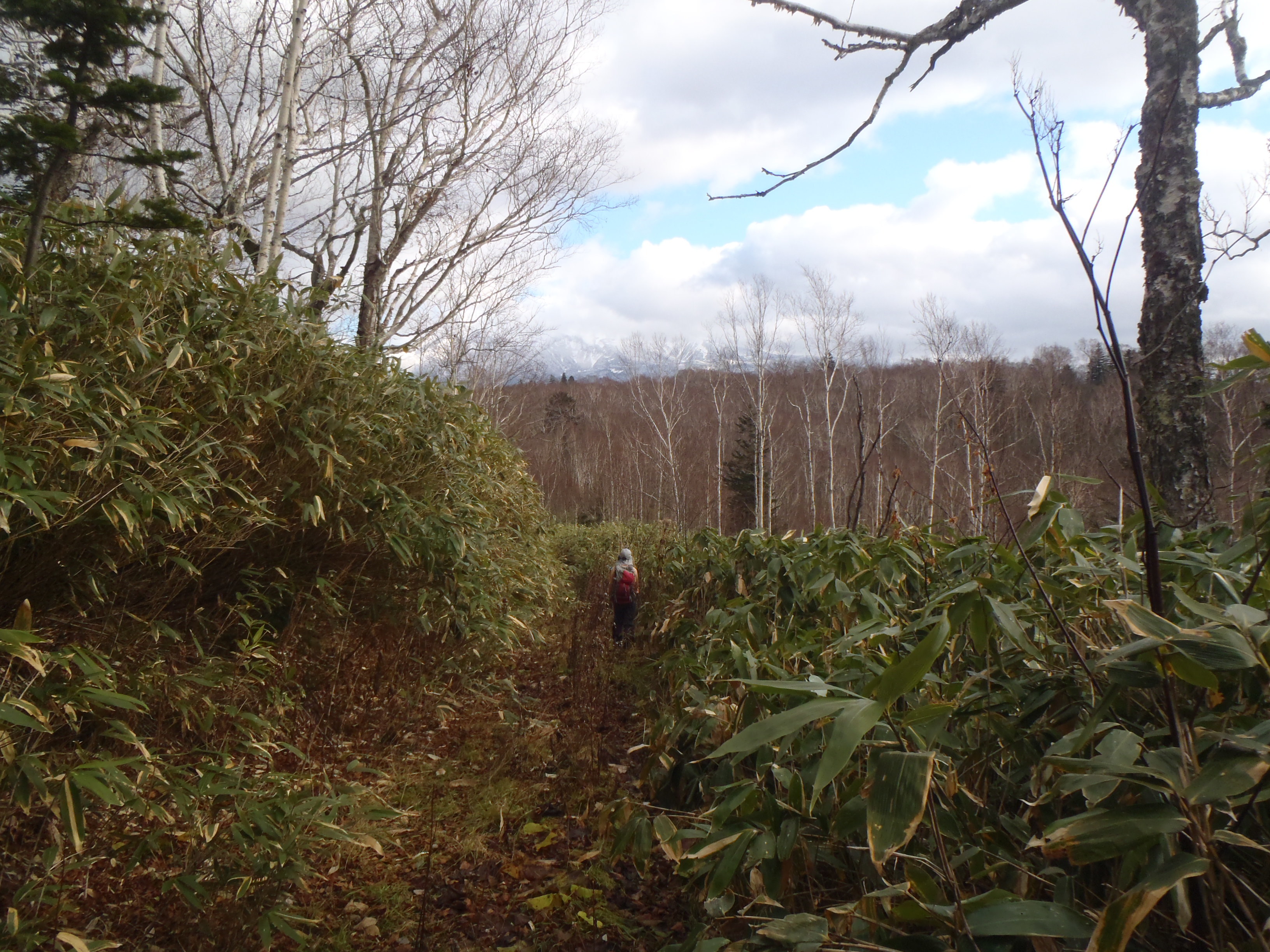 徒歩3km地点 米飯山(ぺーパンやま)が近づくと林道は笹に覆われてきて・・・この先はどうなるのか 不安がよぎります。