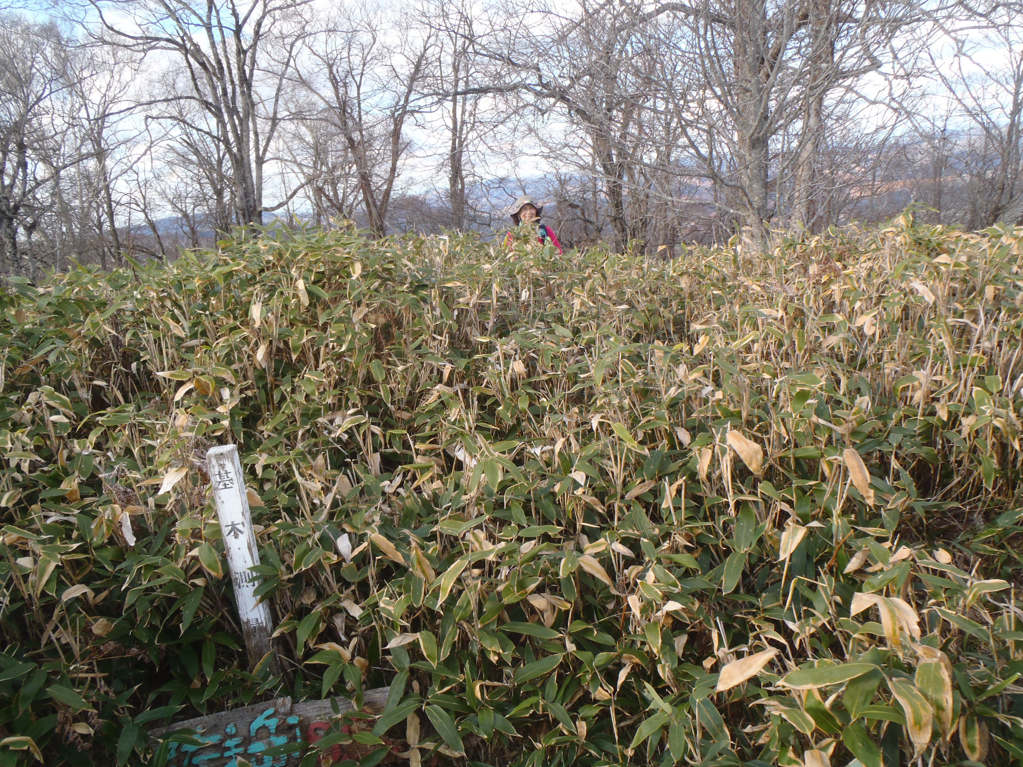 作業道からひざ丈のブッシュを漕いで 山頂台地に到達しました。