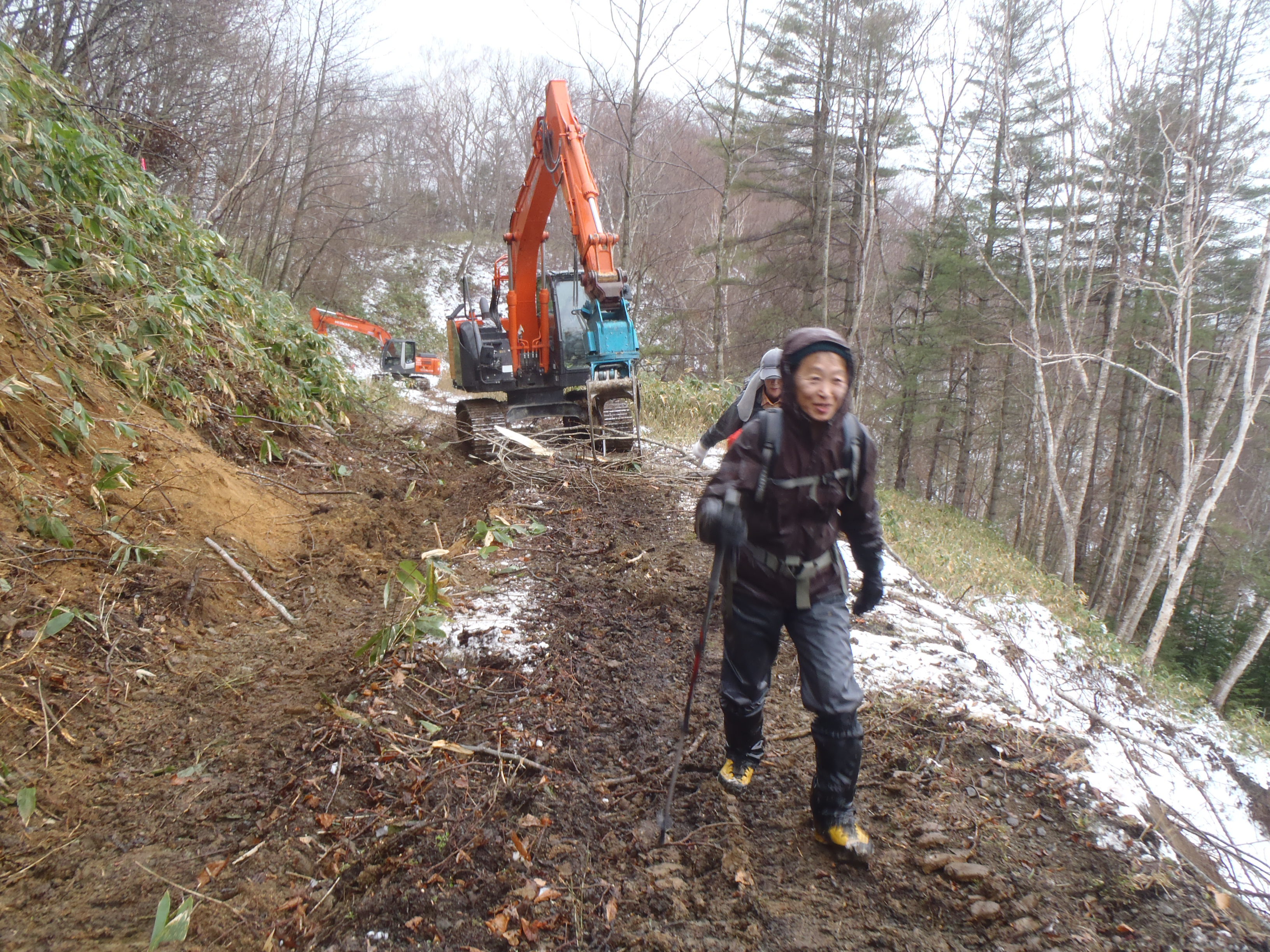 倒木処理と林道補修は2台の重機で同時進行していた。