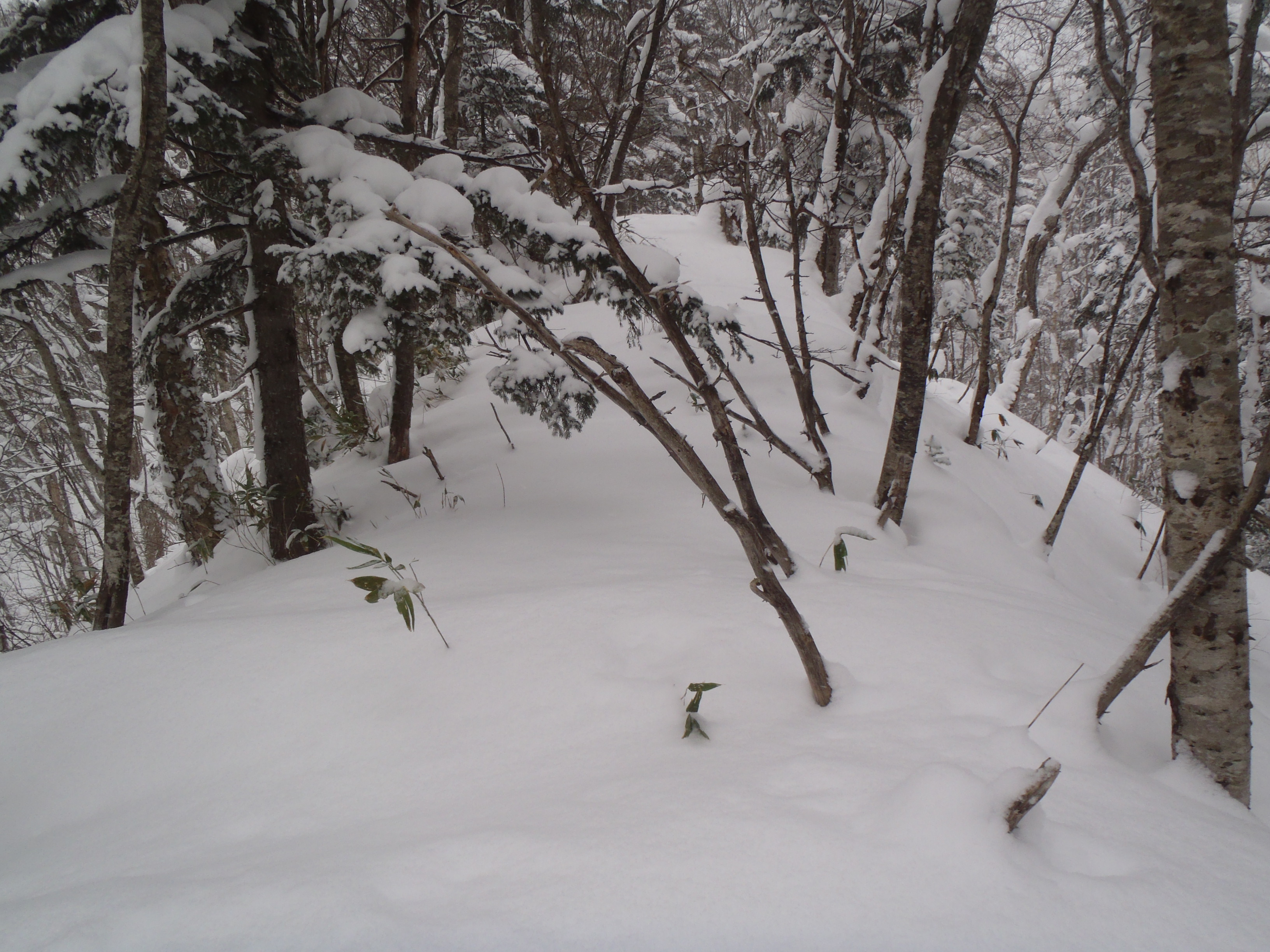 斜面は笹だらけで尾根に上がると潅木や倒木でスローダウン。