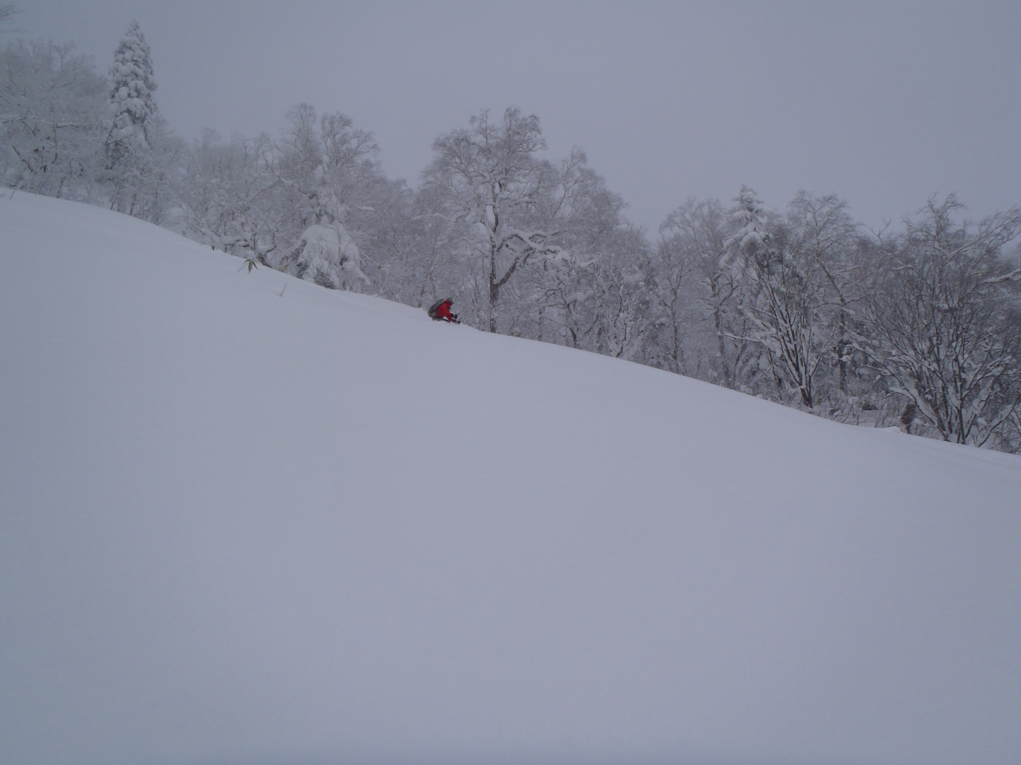曇時々雪 .645から尾根に取りつくと積雪は80cmのパウダーになって膝のラッセル スキーがウッシウッシ。
