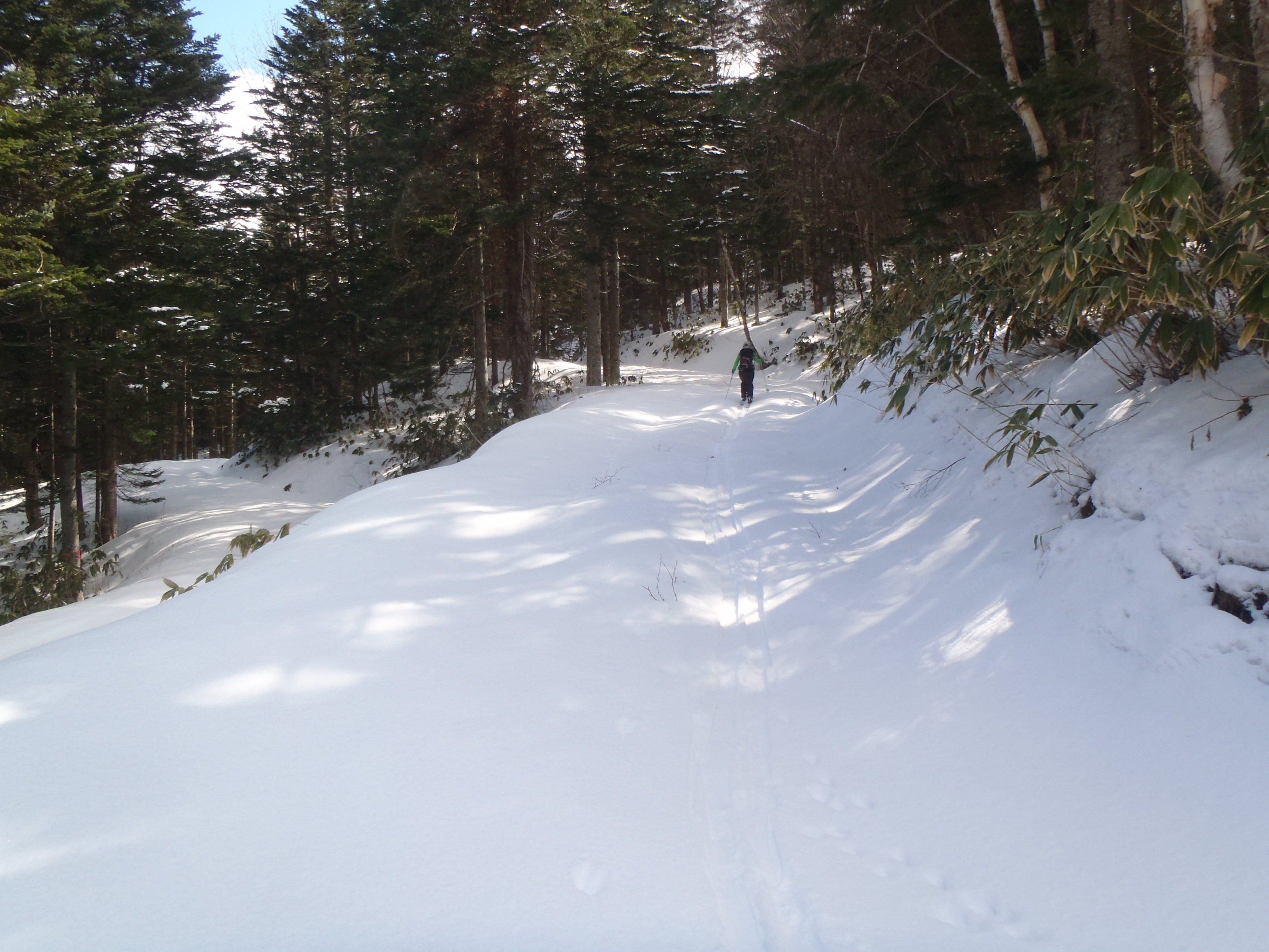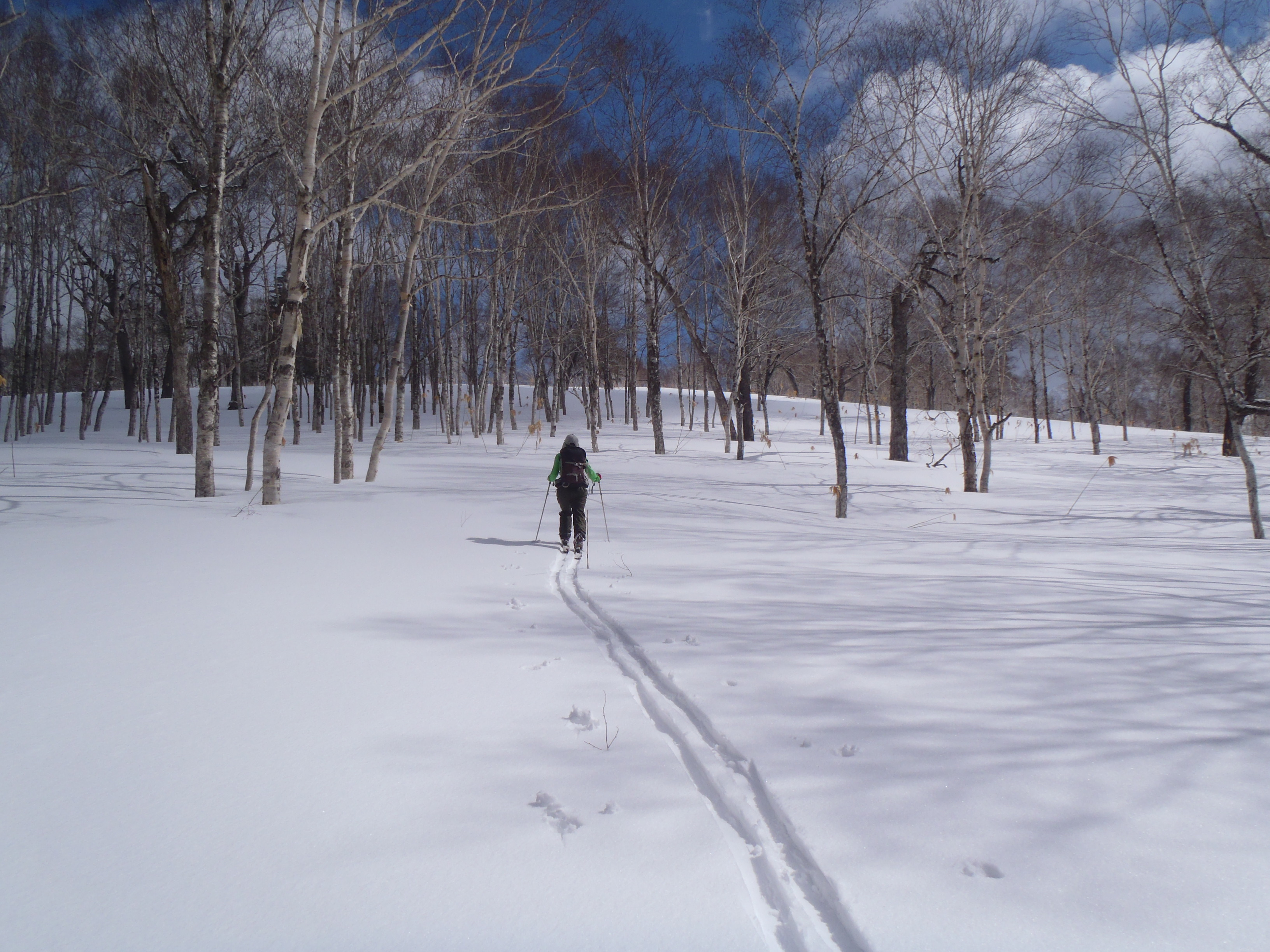 例年に比べて南斜面の雪解けが早いので スキーでの歩行は少し心配になりました。