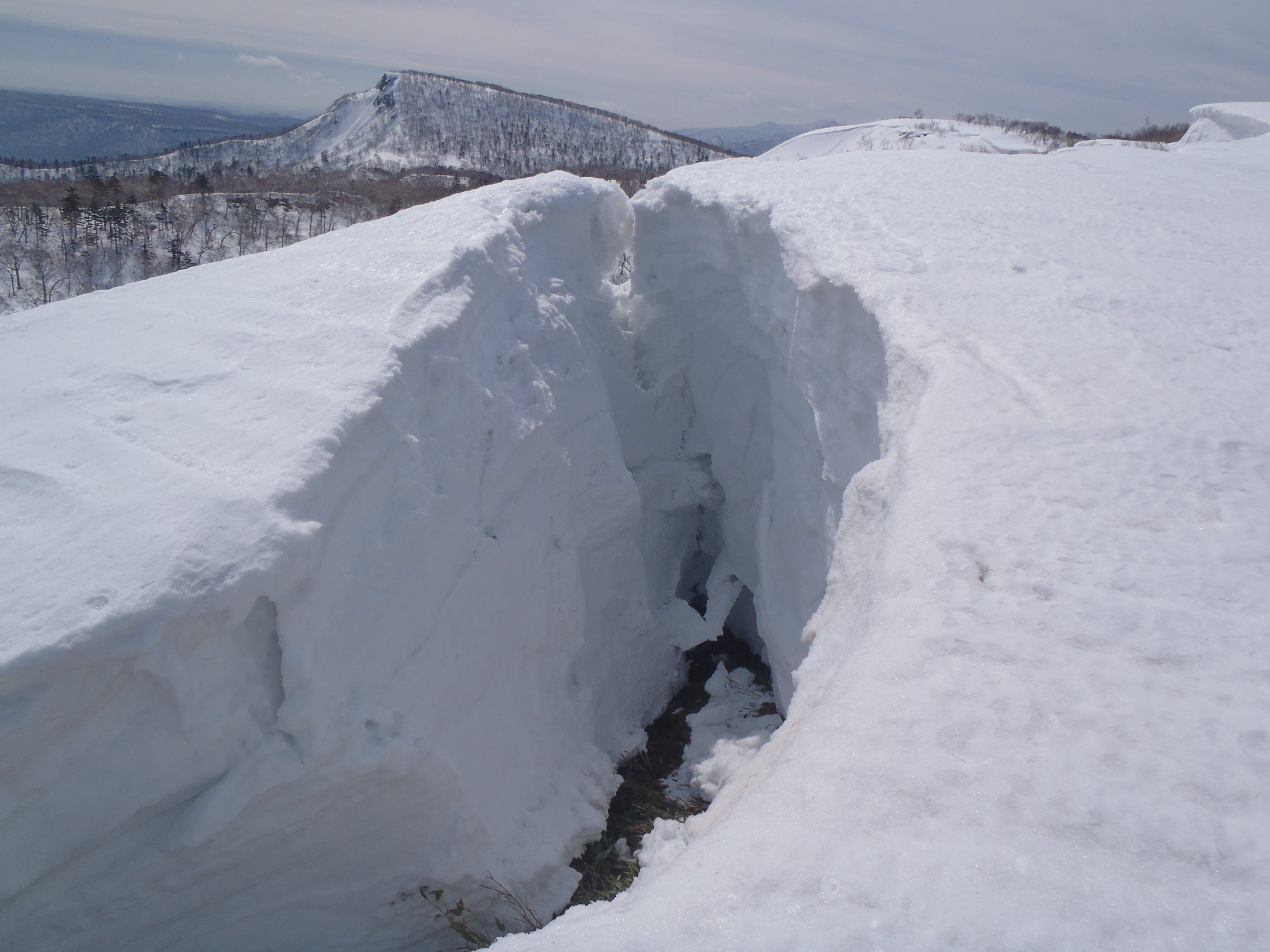 雪庇の厚さは4m クレバスのむこうに丹鳴岳とフレ岳。