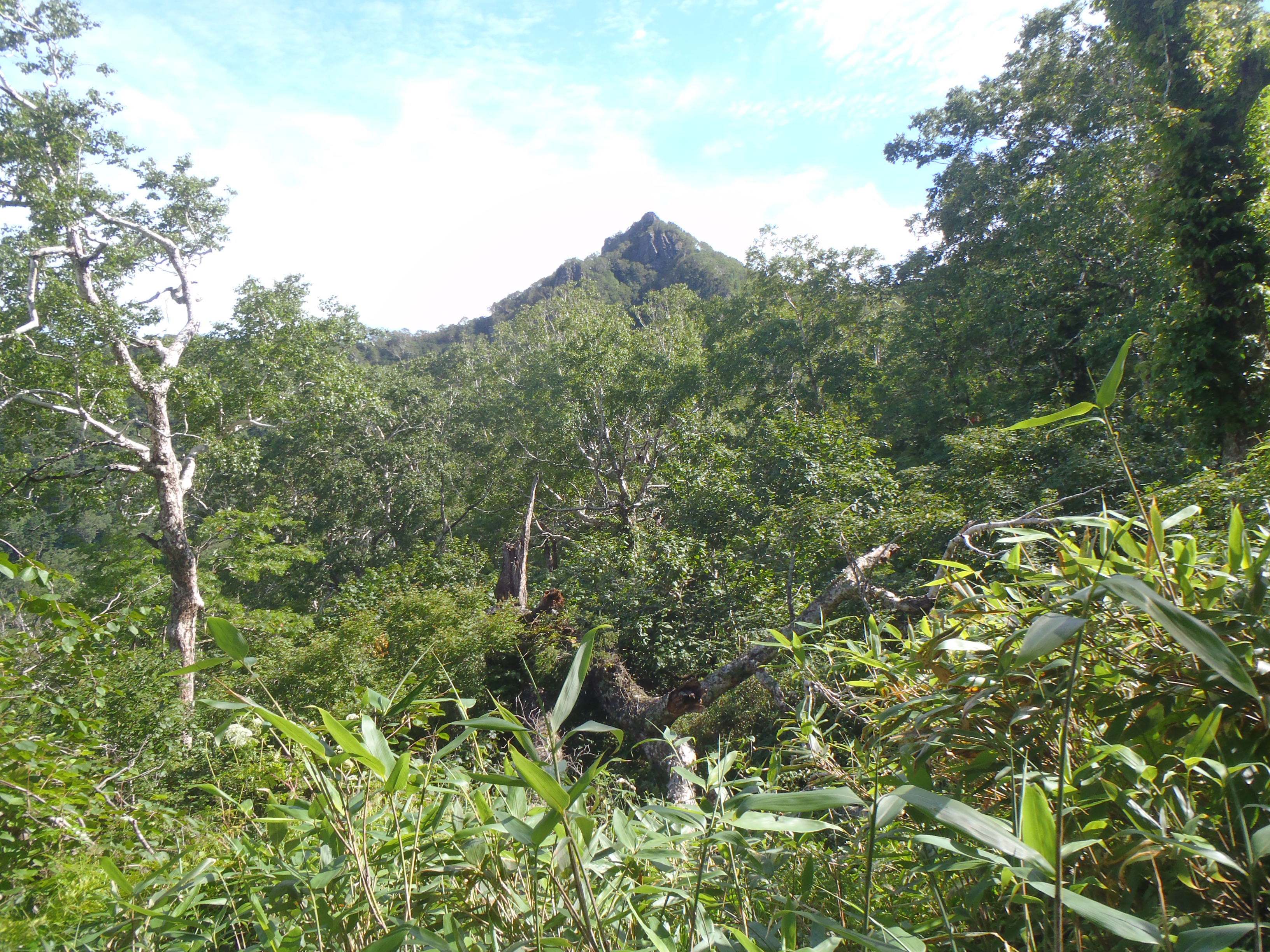 ミヤマハンノキ掴んで急斜面よじ登り、ハイ松漕ぎ分けピークに達する。