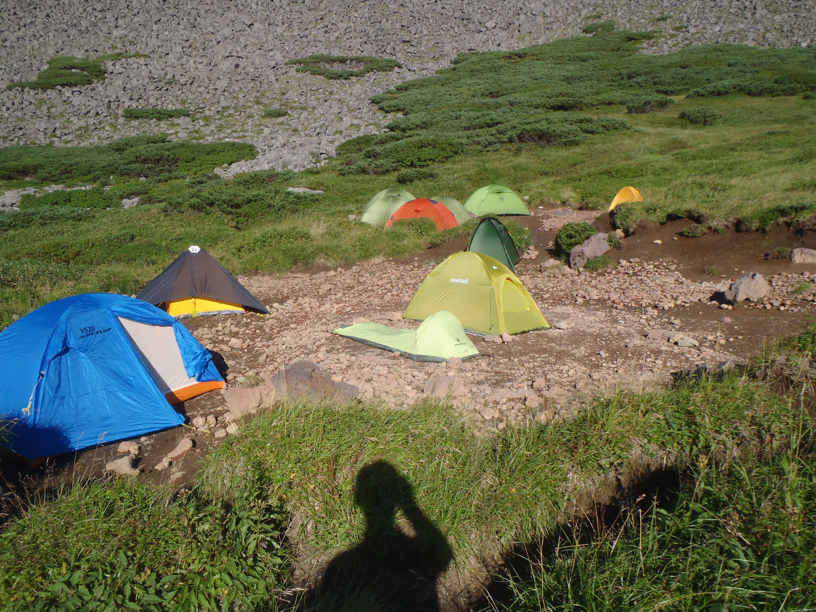 避難小屋周辺には20張りの小型テントでサイトは一杯。
