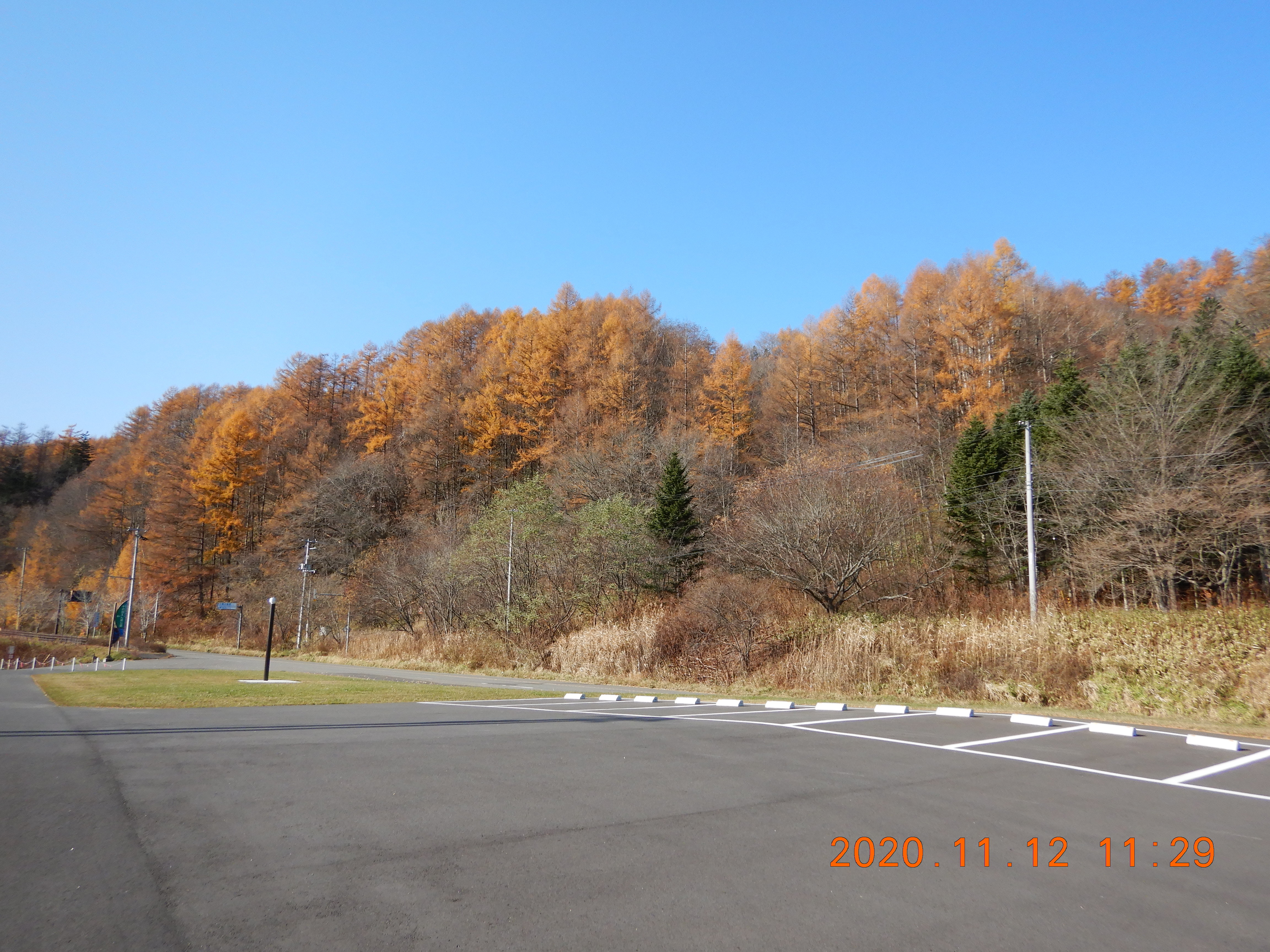 留真温泉から2か所の伐採現場を通り抜けて18km 悪路を1時間近く走り山頂近くまで車で登り詰めました。