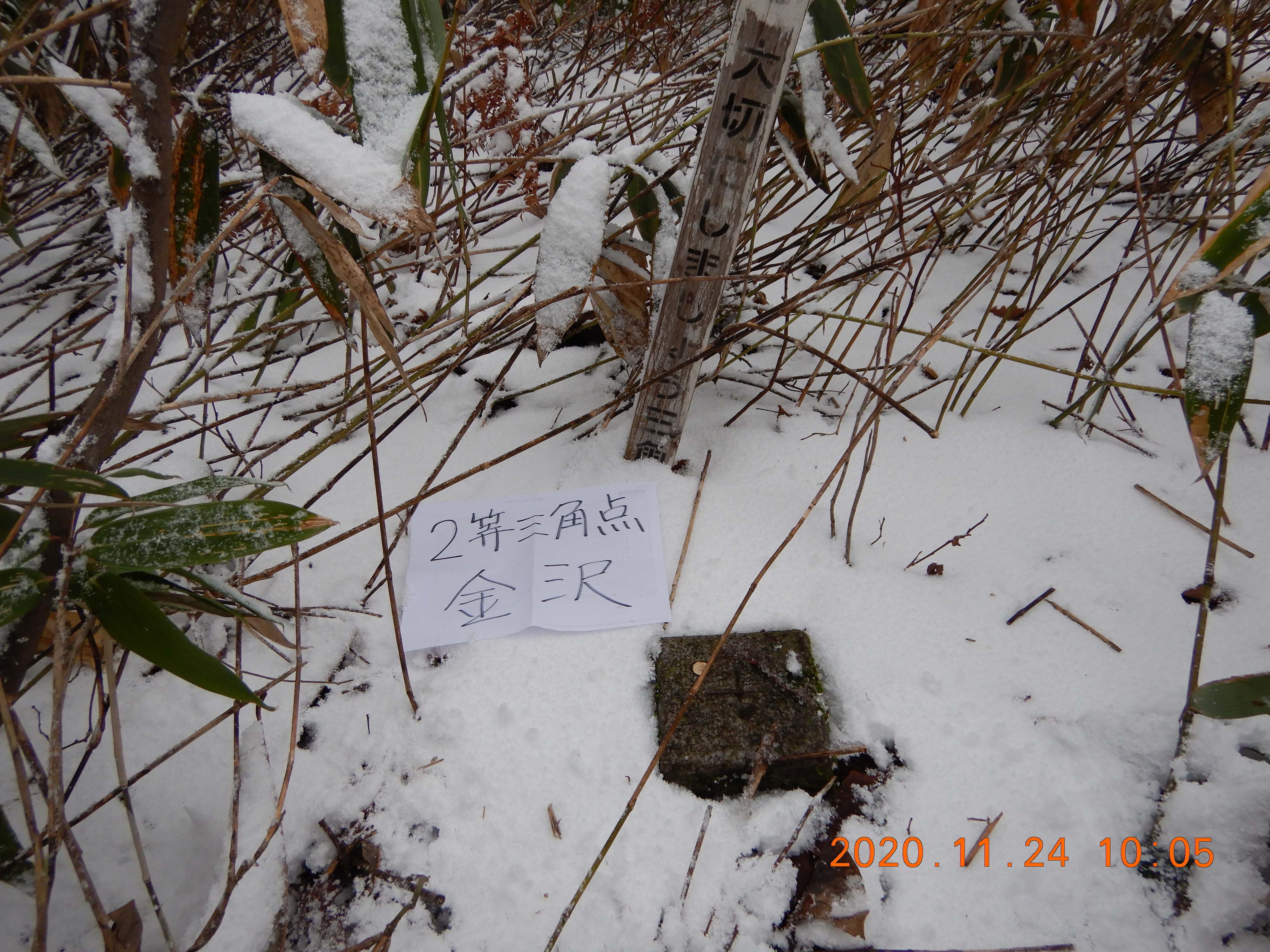 駐車地点から5分ほど探し回って 藪の中に2等三角点・金沢を見つけました。