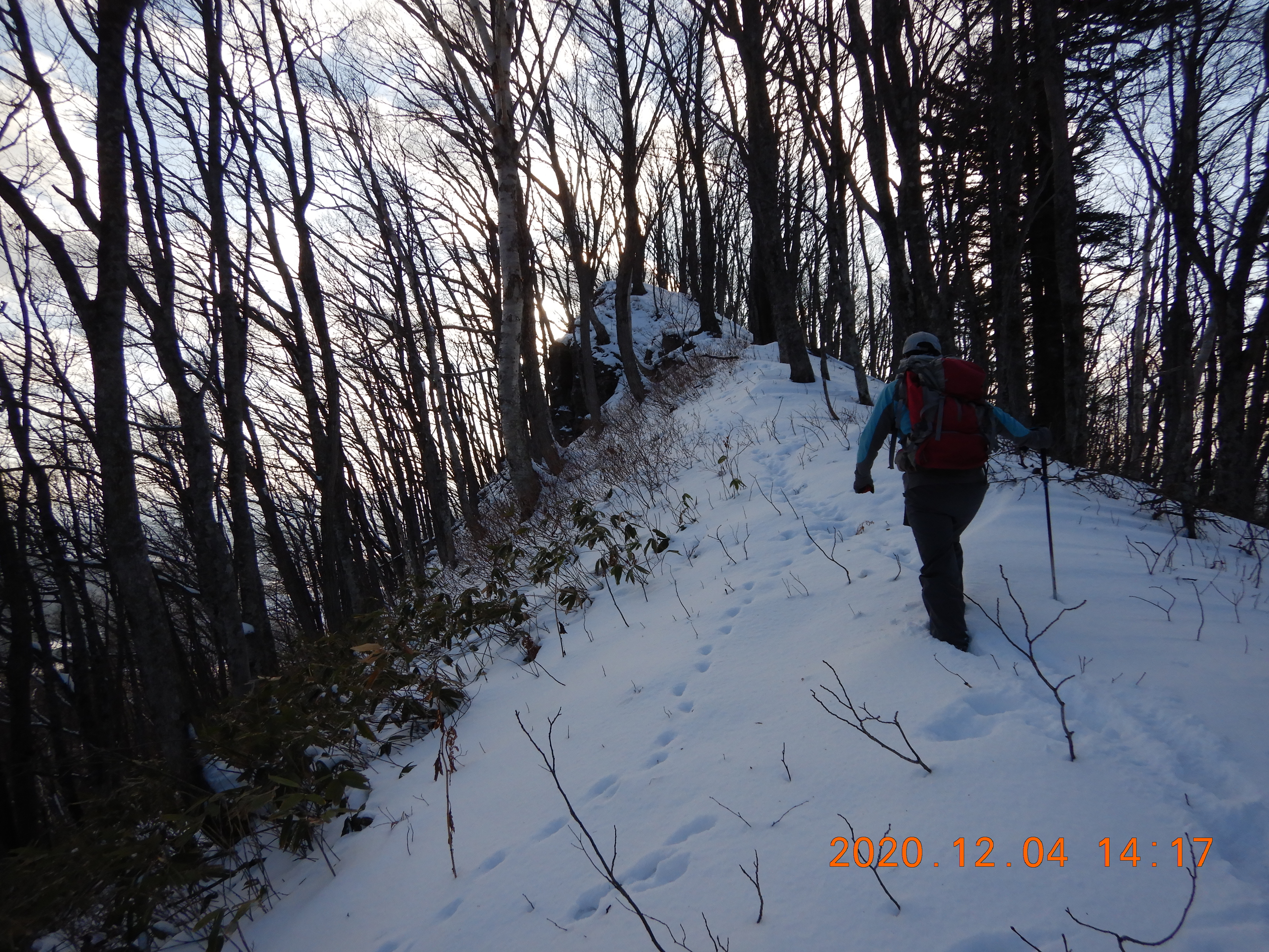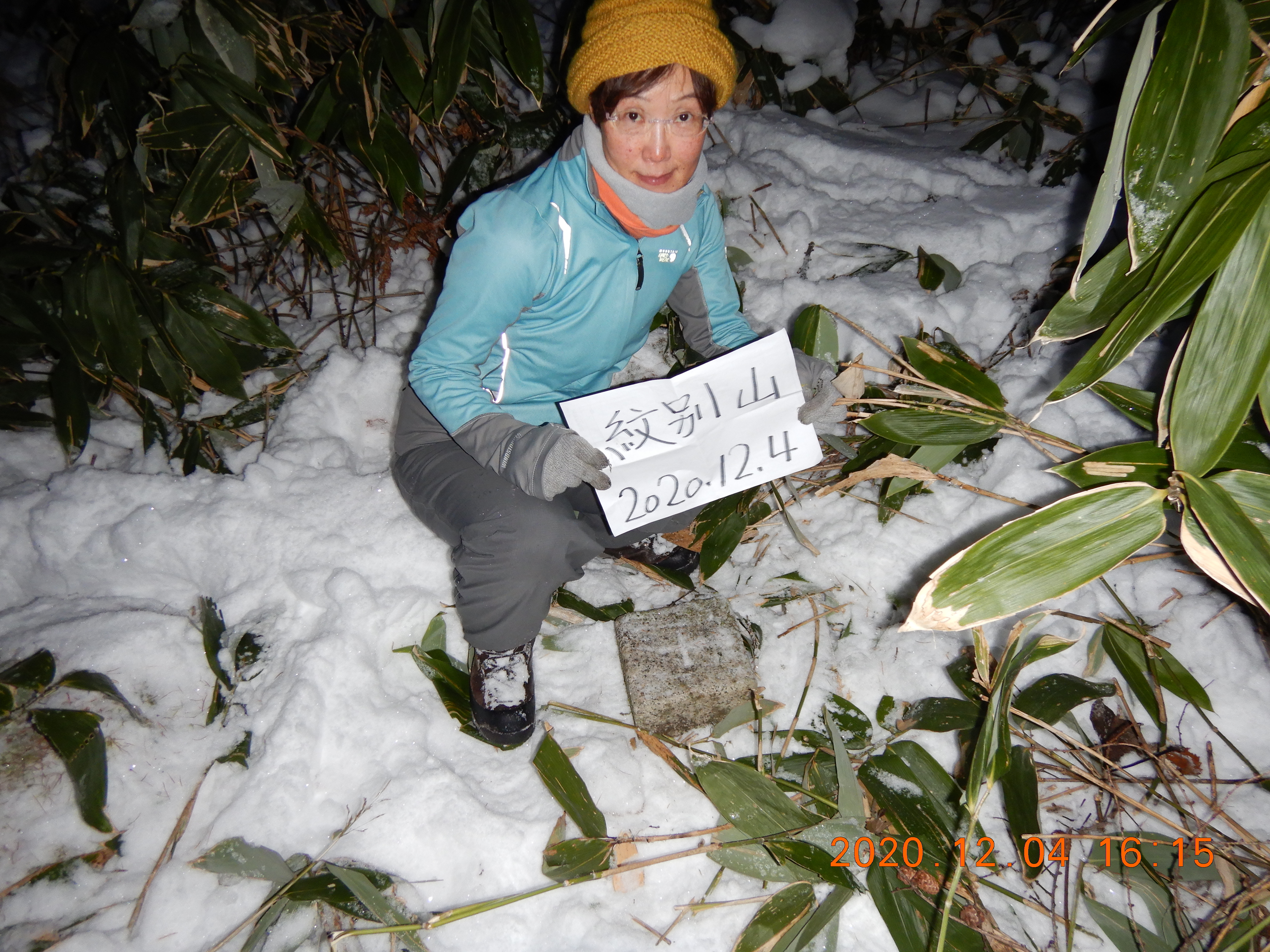 暗くなってきたので時間との勝負 雪に埋もれた標柱をギリ発見しました。