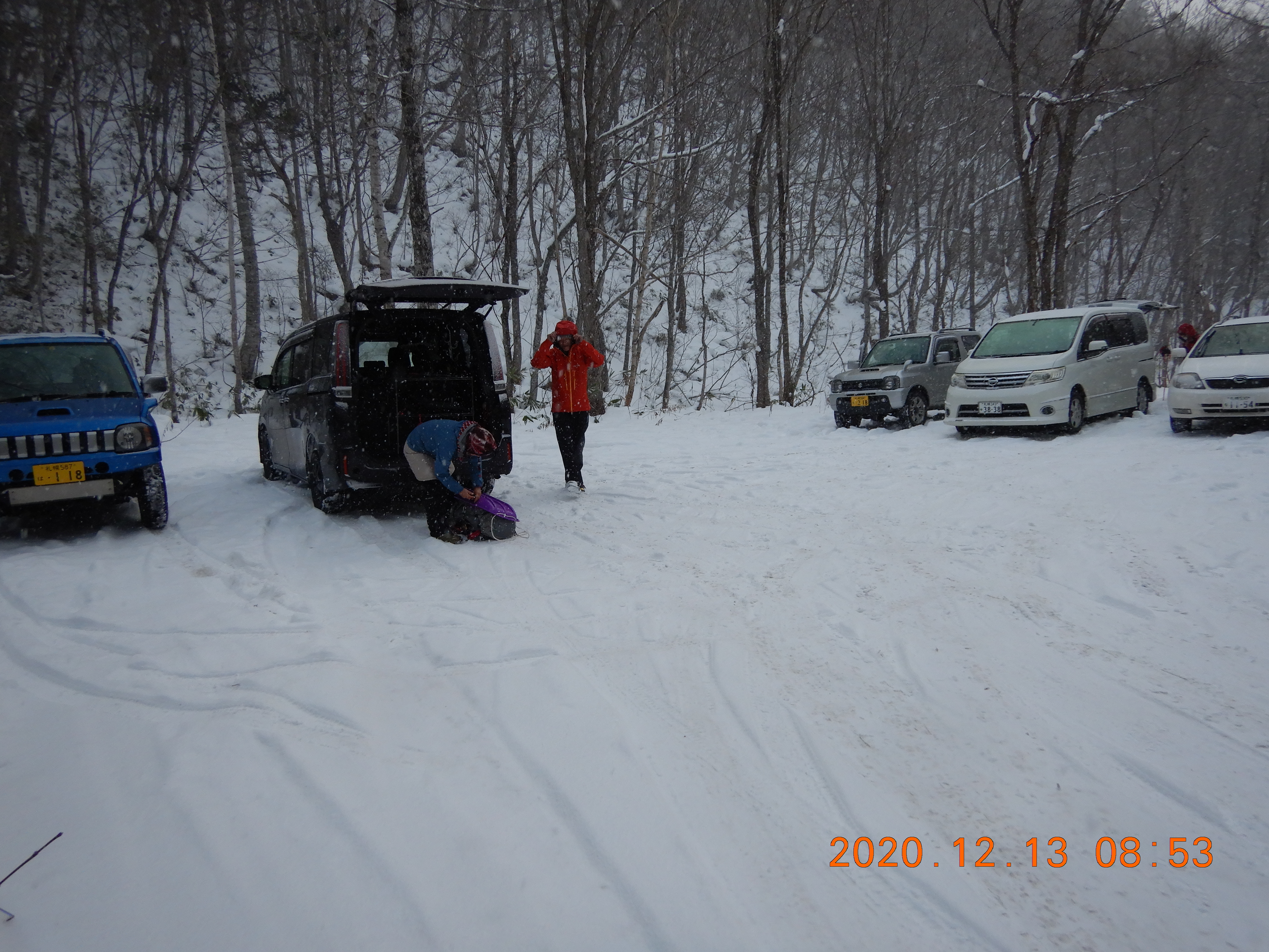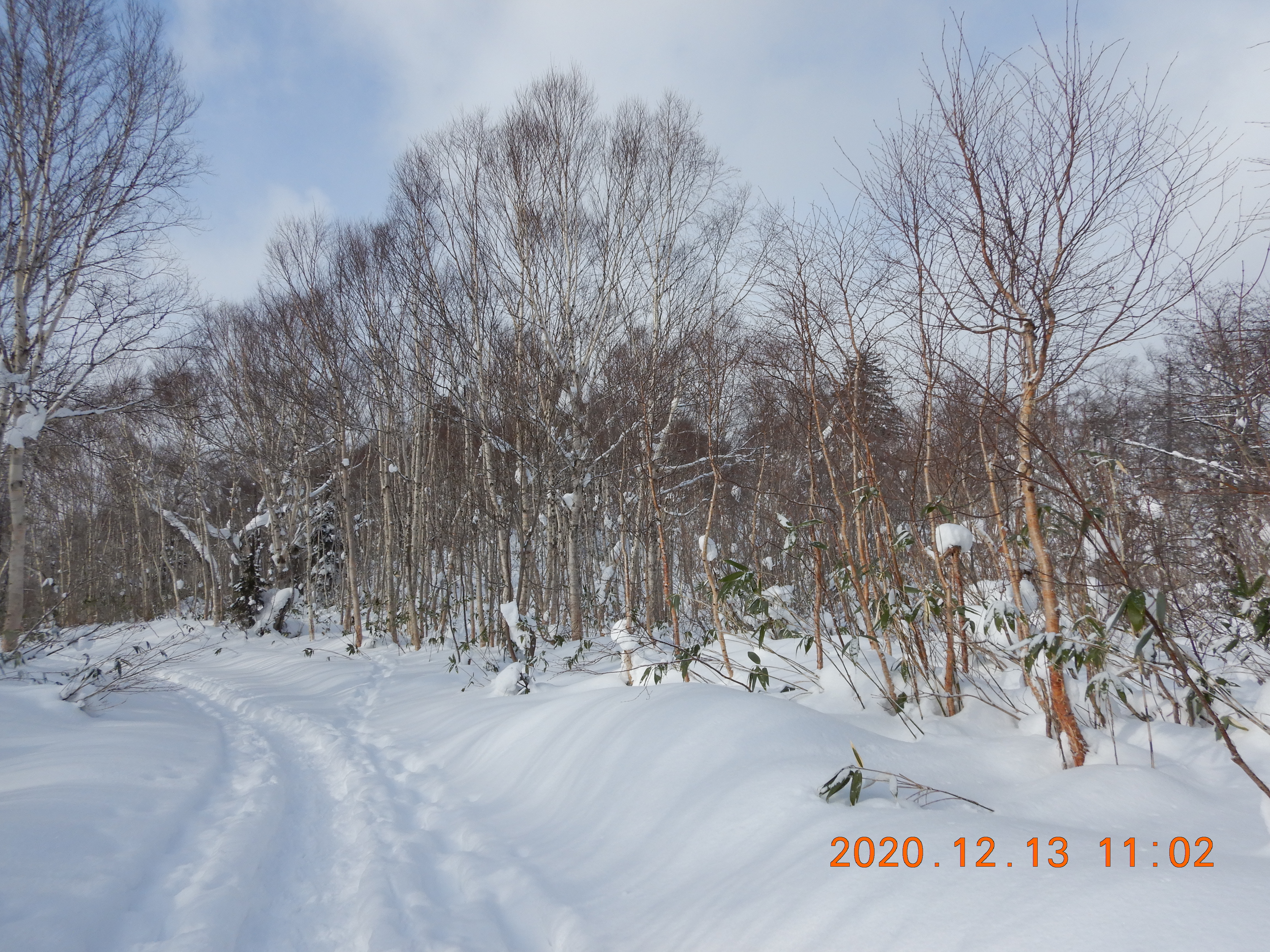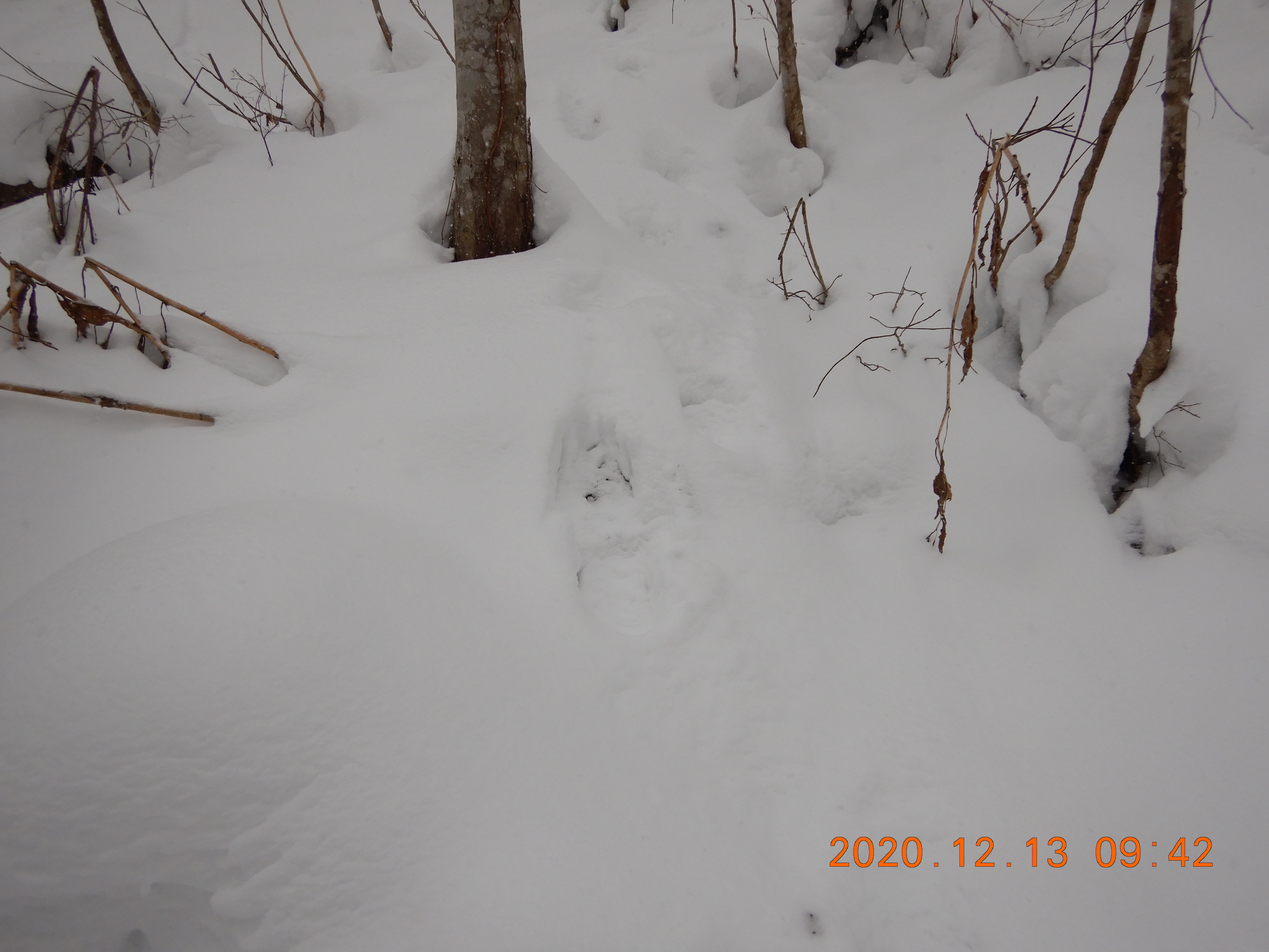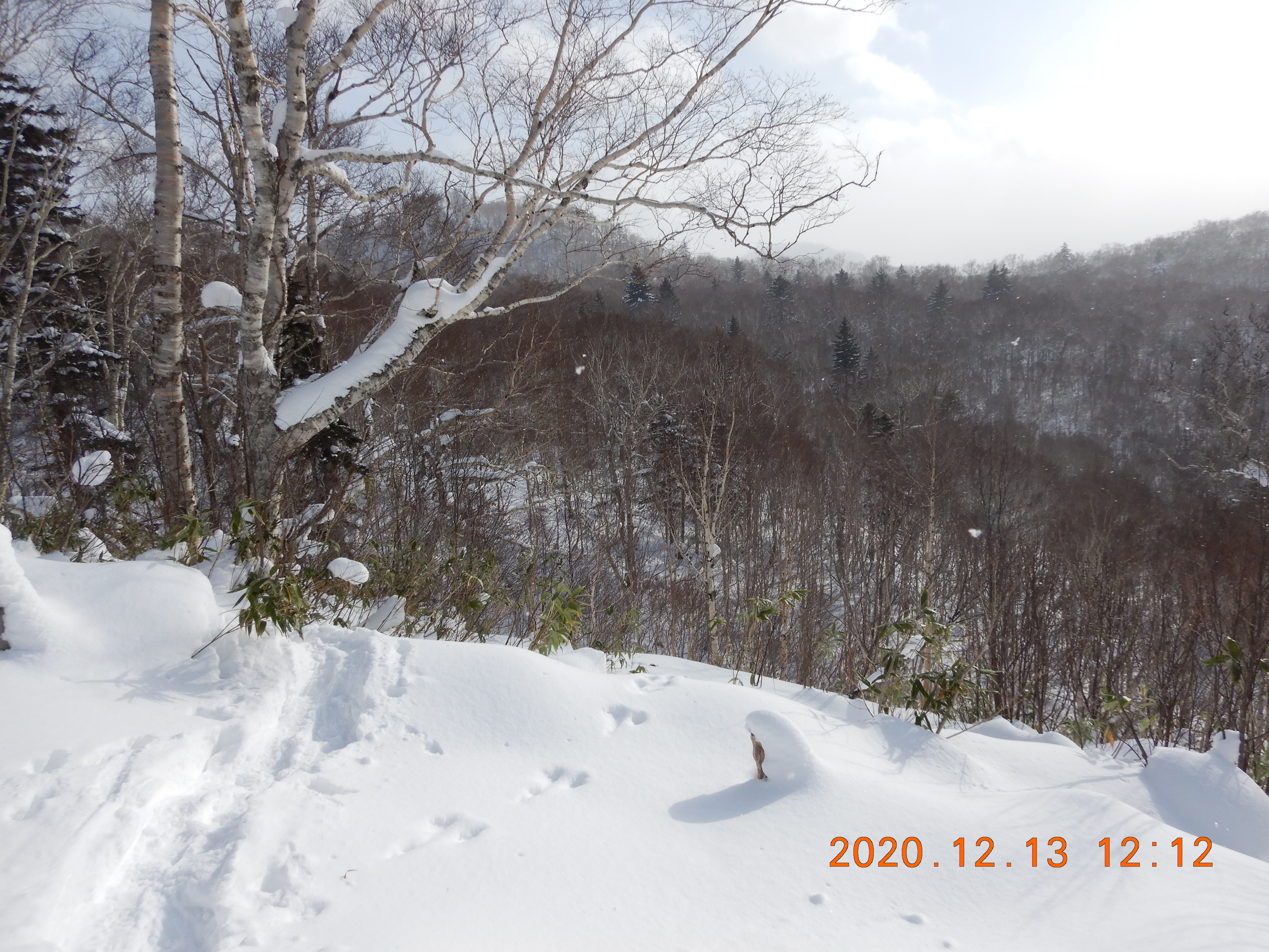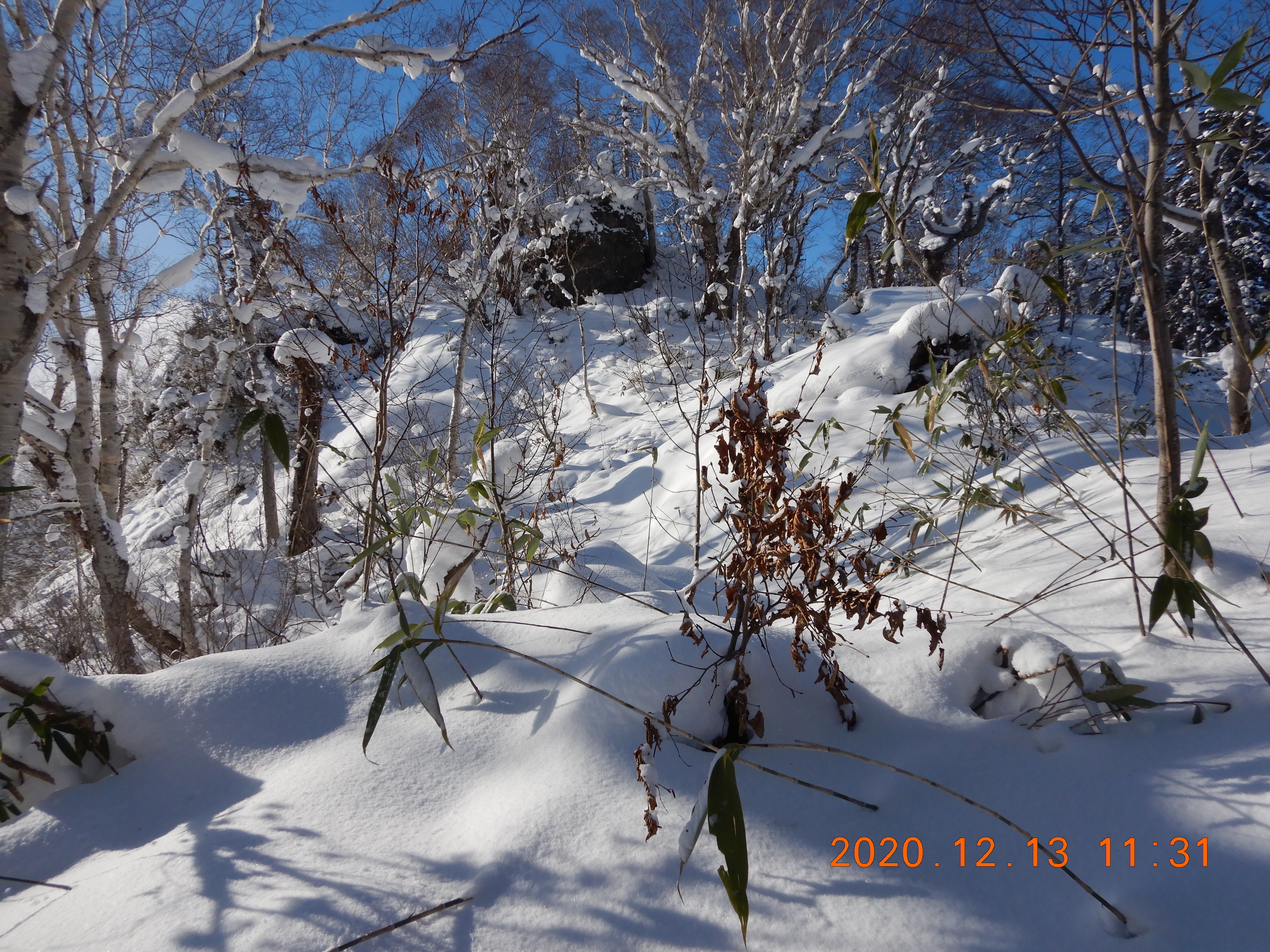 積雪は不安定でブッシュを掻い潜るトレースは300m続いていましたが 登頂を諦めて引き返していました。