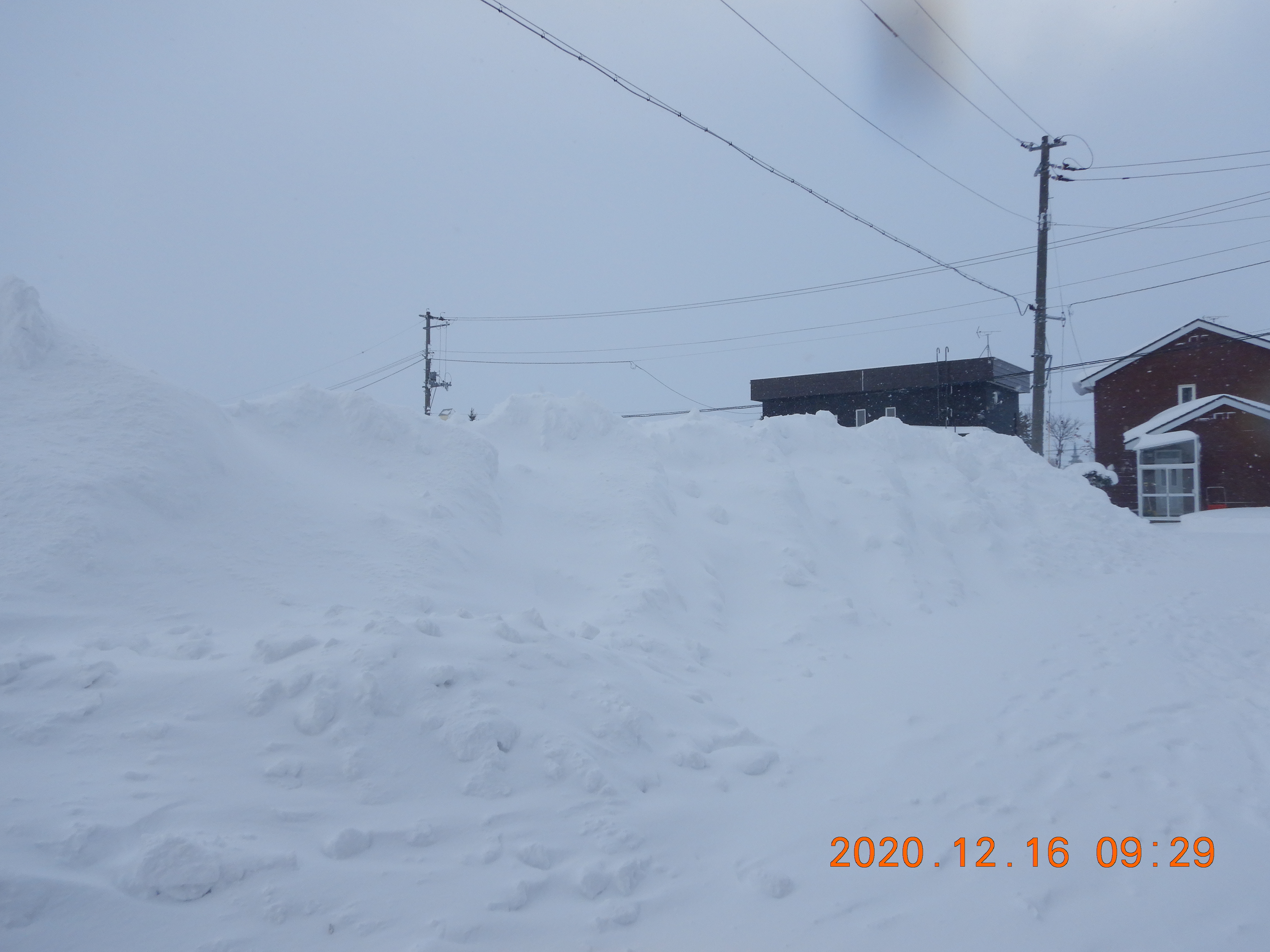 重機で押した雪の山は3mに達し お向かいの家が見えなくなりそう。