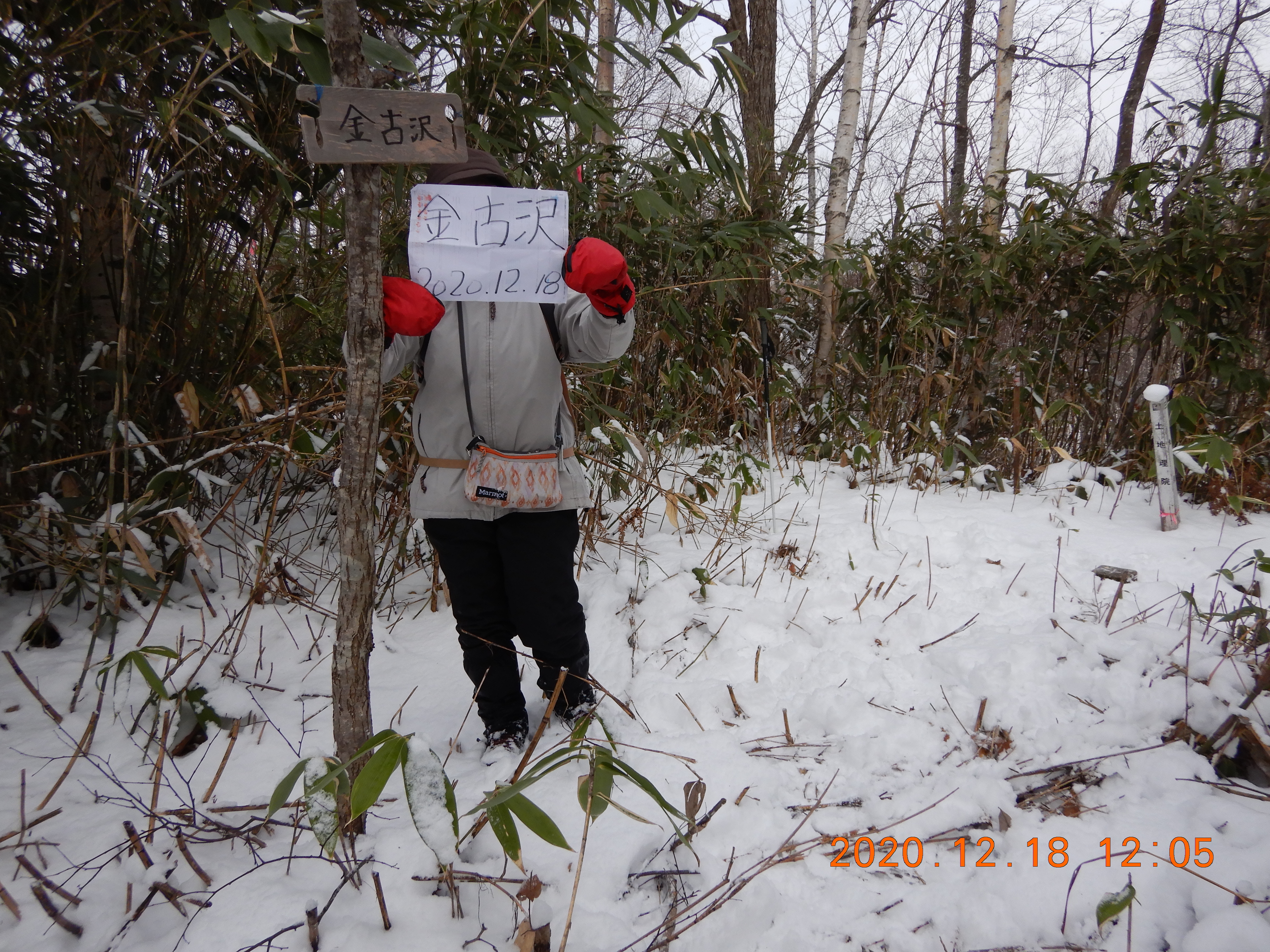 ピンテに導かれて刈払いを登ると山頂標識のある「金古沢」317mが見つかりました。