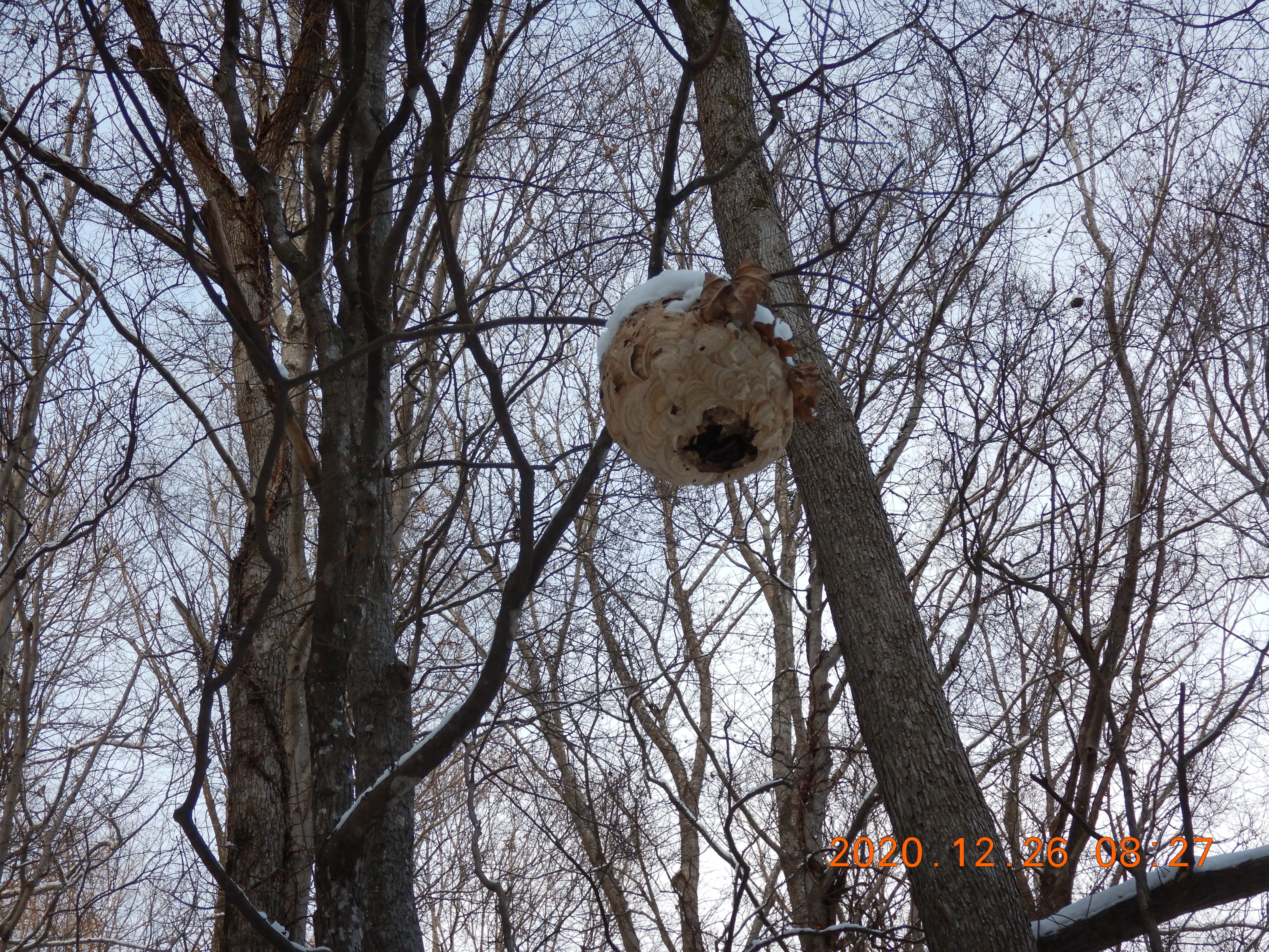 盤溪スキー場の西側にある林道入り口に駐車して歩き始めめると 頭上に大きな巣が残っていました。