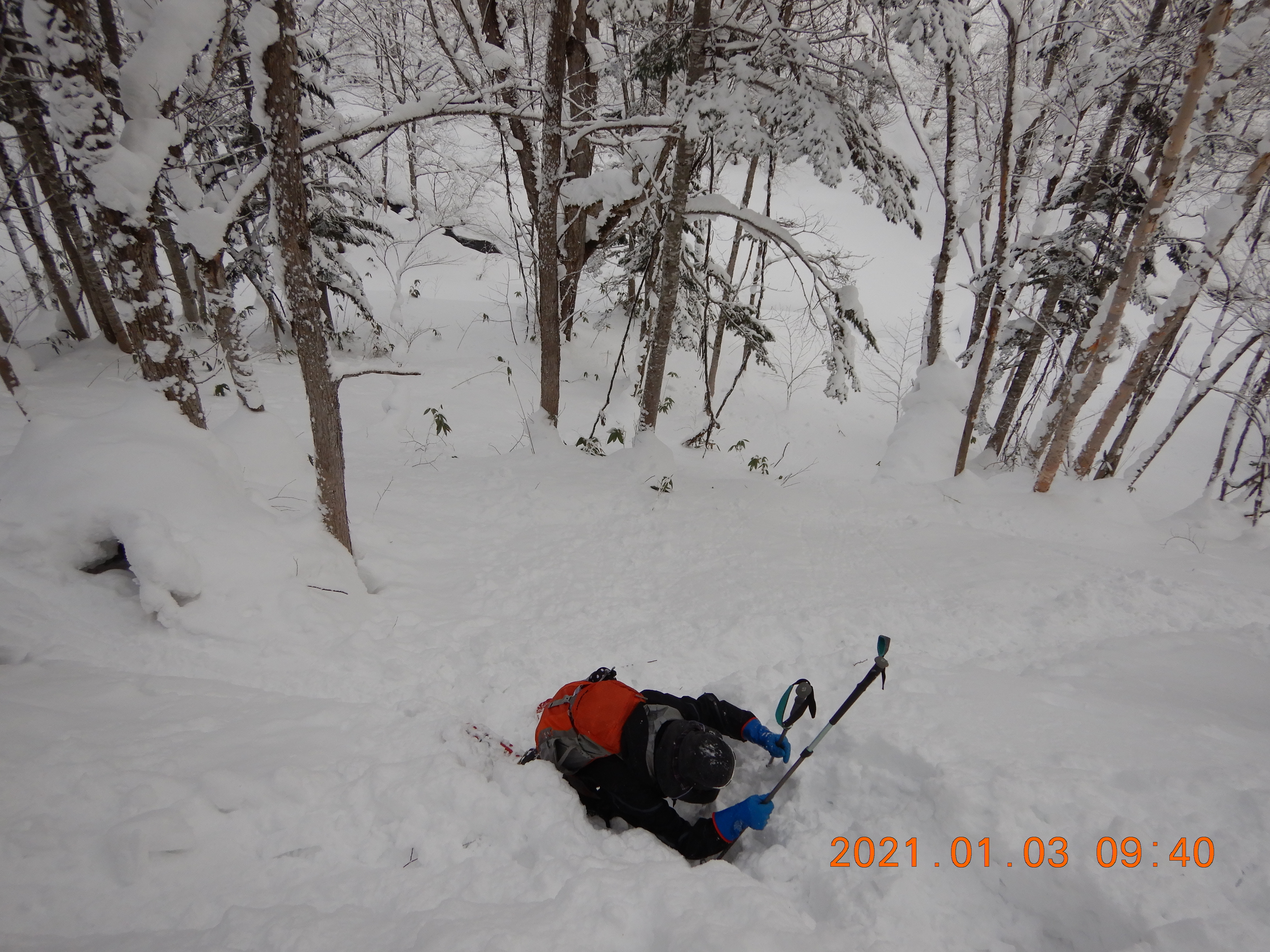 今シーズン初めてのスノーシュー 足がもつれて七転び八起の達磨さん。