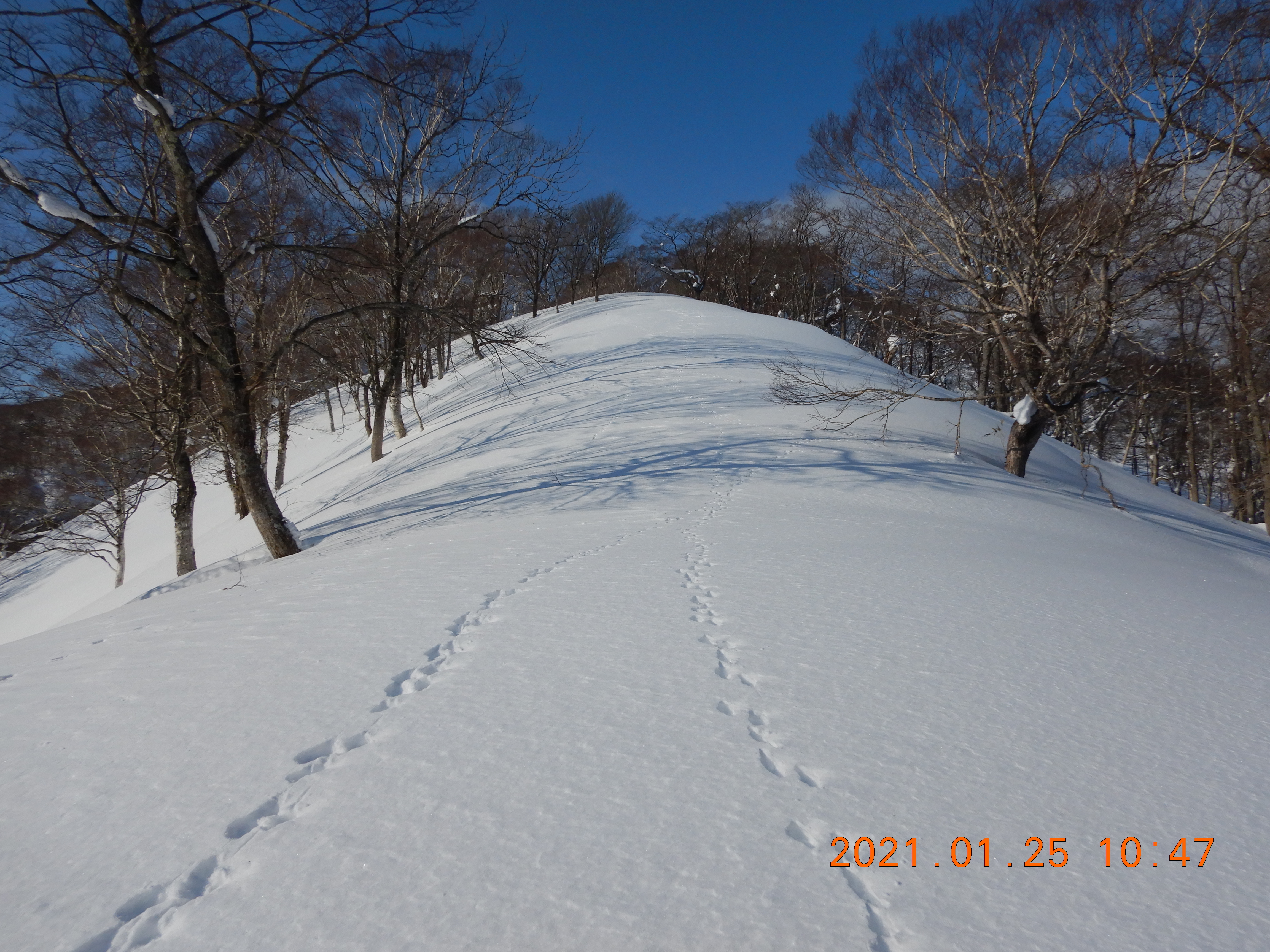 北東尾根に取りついて林道を辿ると 正面に自衛隊基地と目指す白い斜面が見えました。