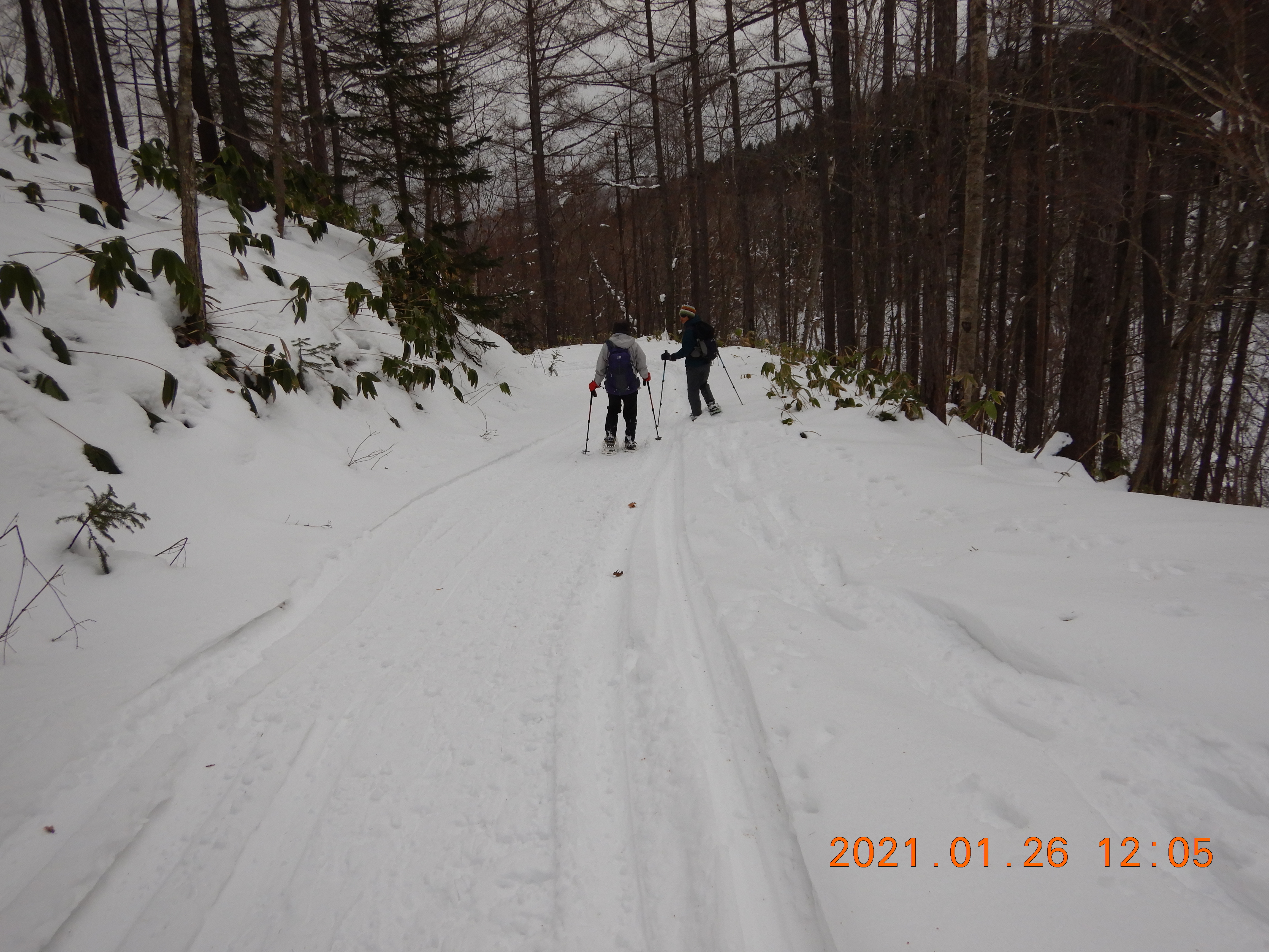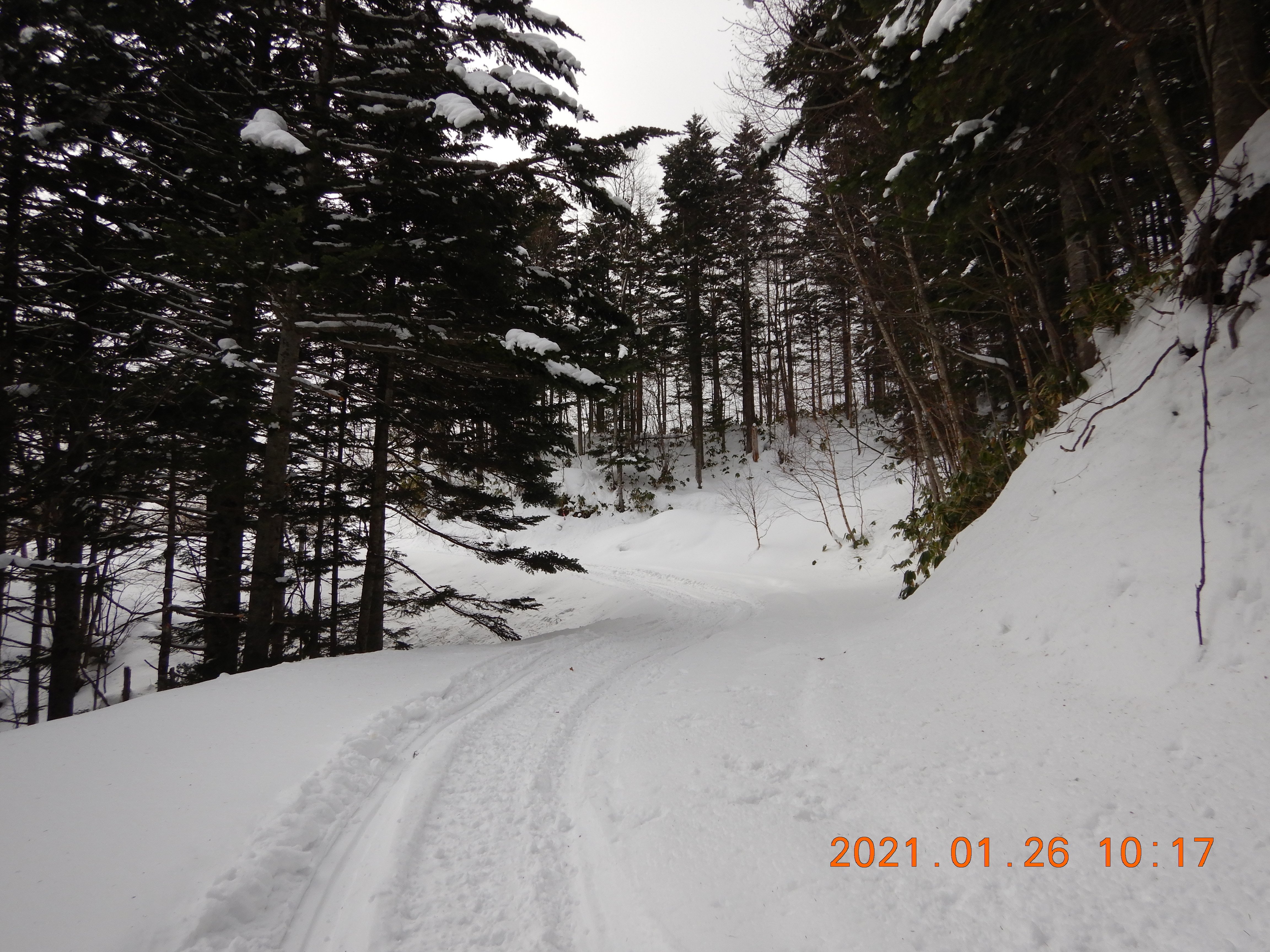 積雪は40cm 雪質はモナカですが 林道にはモービルのトレースがあって簡易舗装道路みたい。