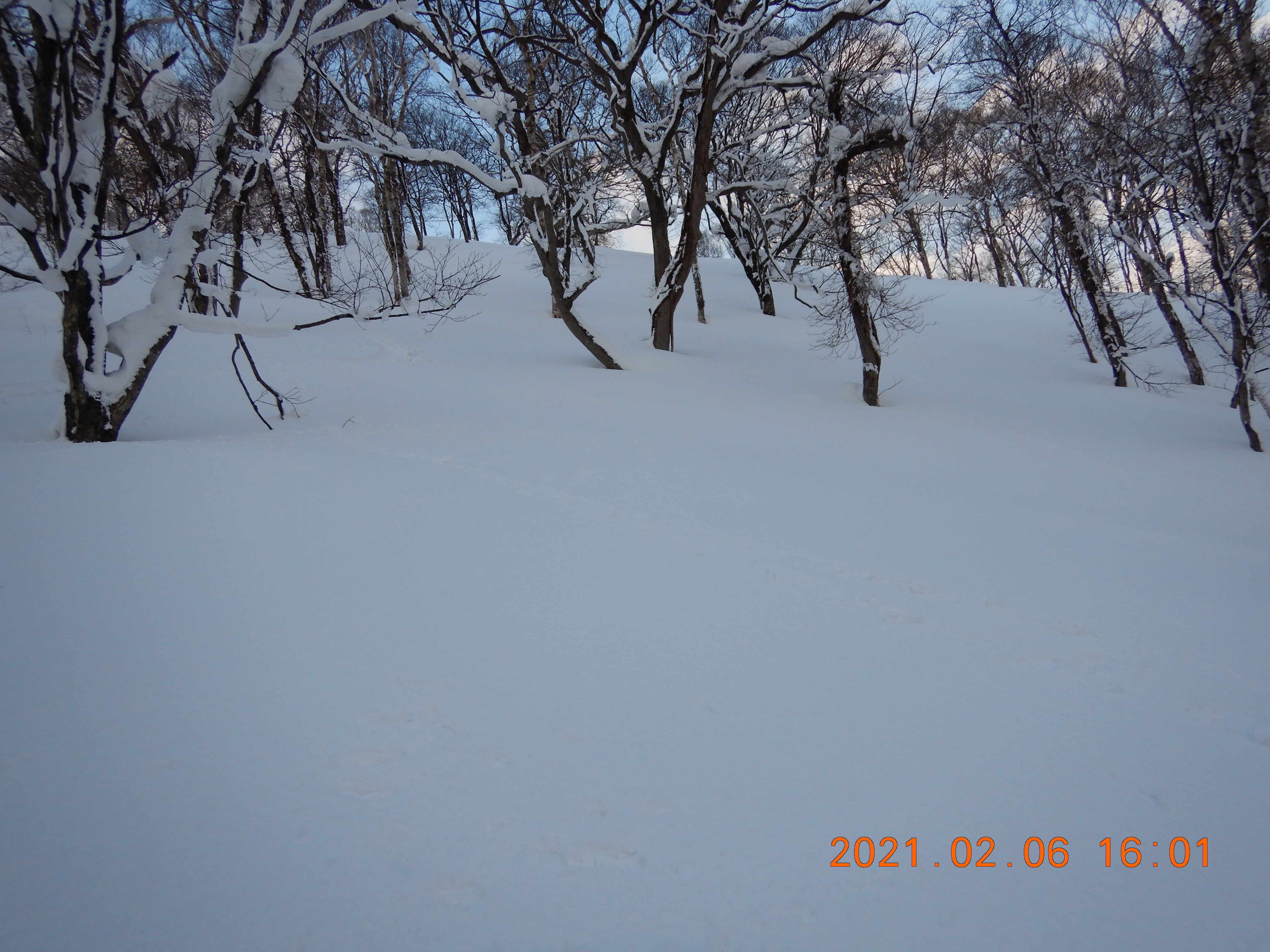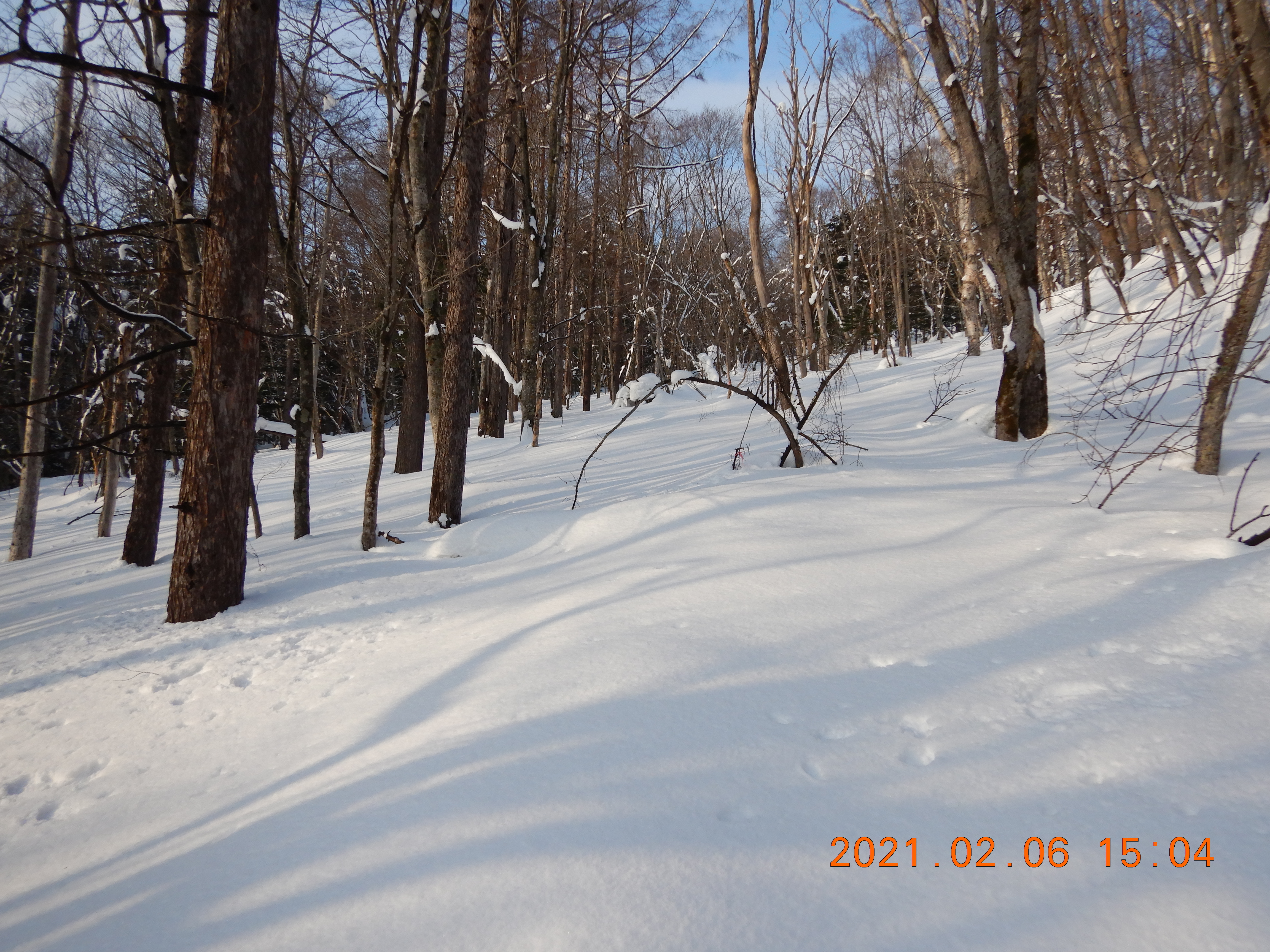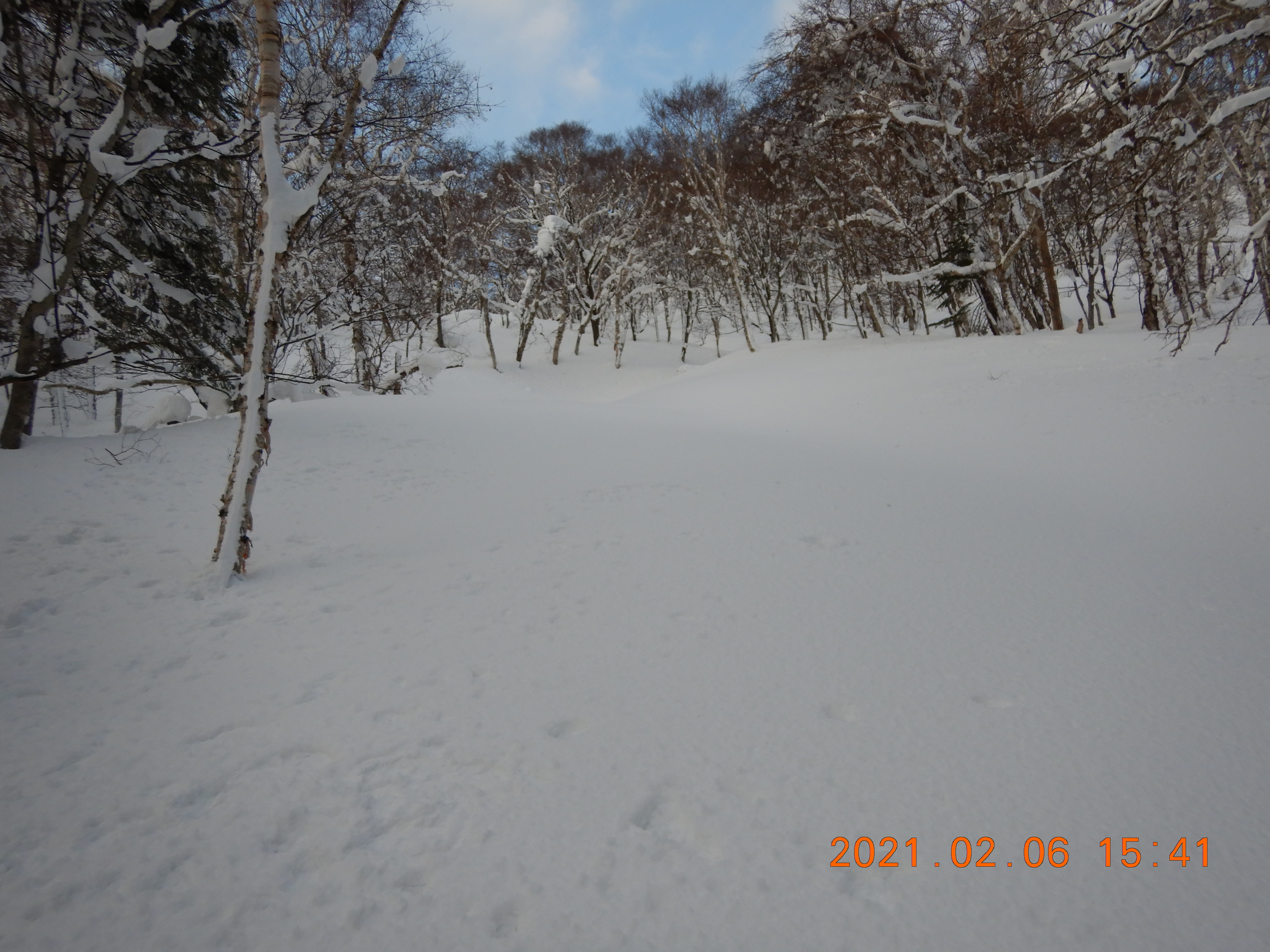 「怪しい施設」の横を通り抜けて尾根に出たら・・・予想通りなかなかイイ斜面が広がっていました。