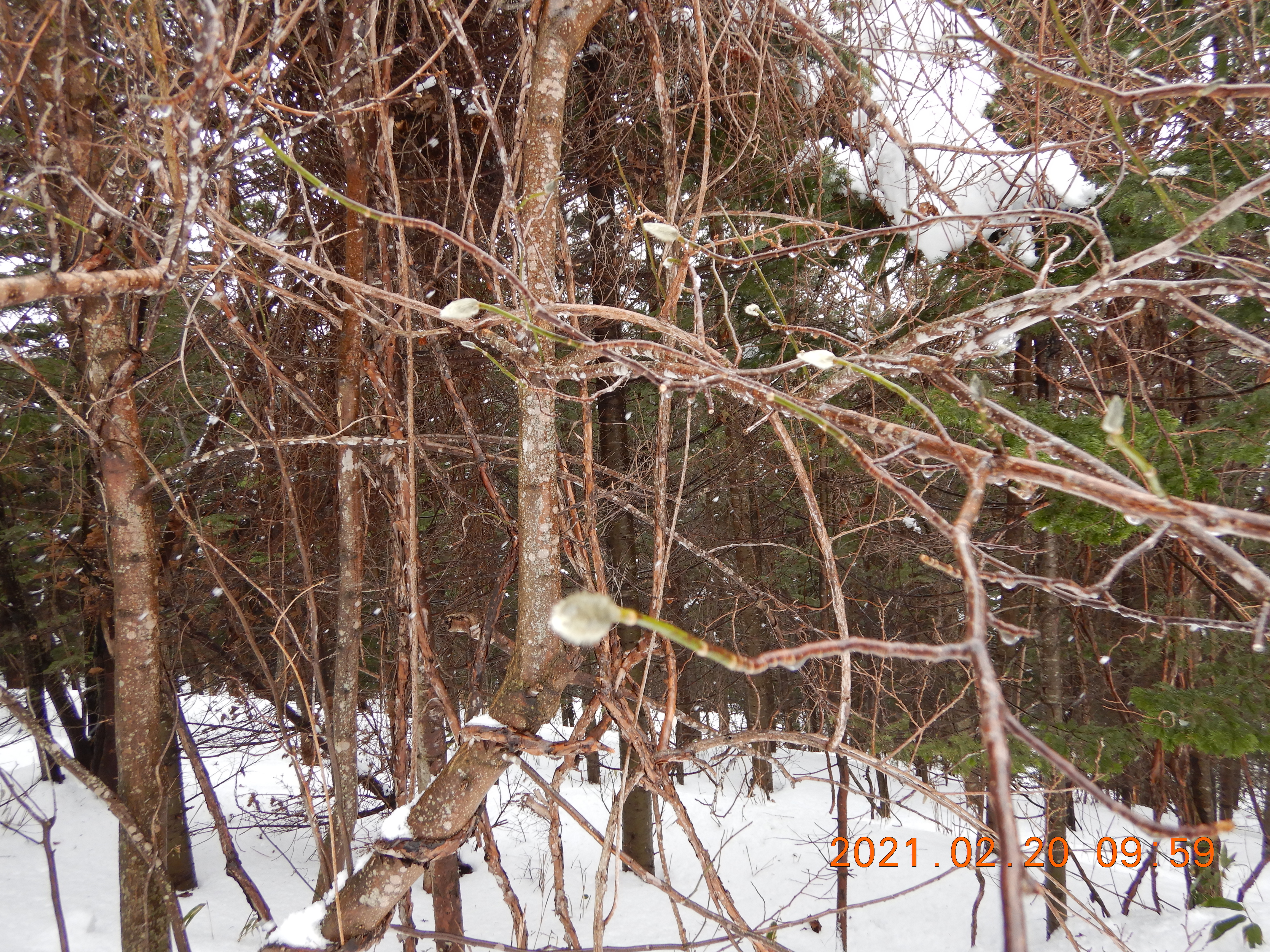 620mポコをトラバースしていたら 気の早いネコヤナギが芽吹いていました。