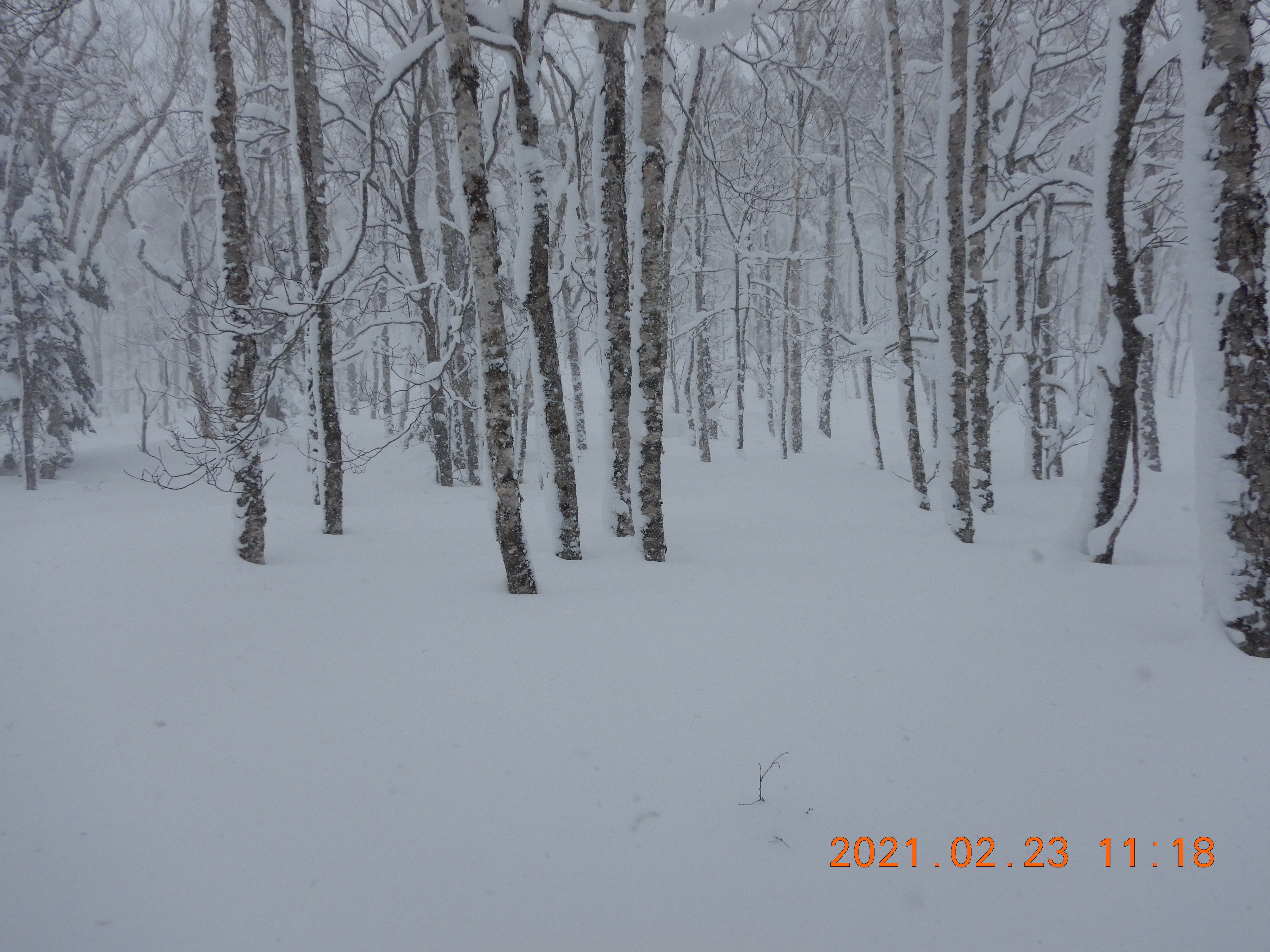 ラッセルに喘ぎながら800mの稜線まで来ると雲の中で やっぱり吹雪いていました。