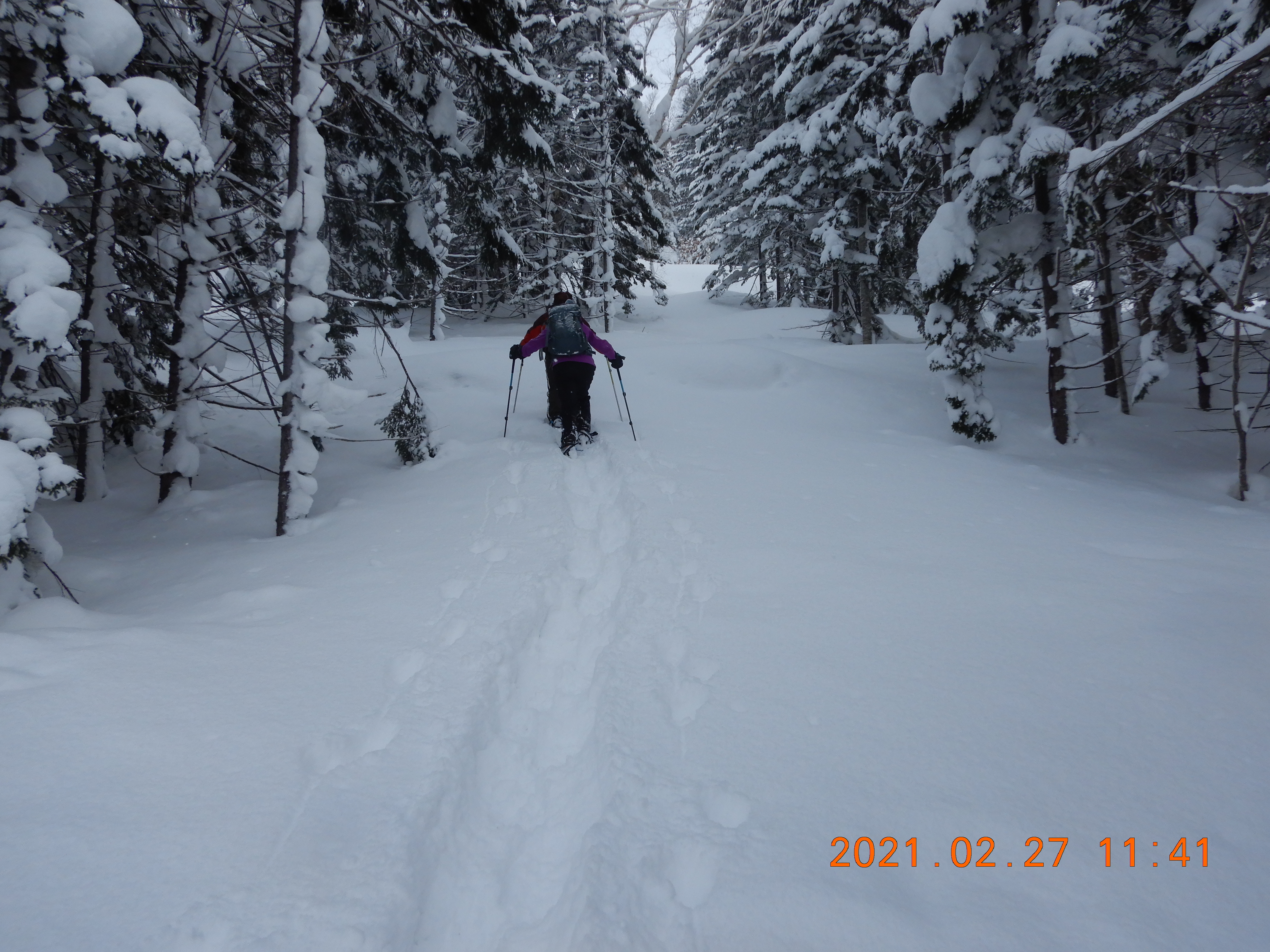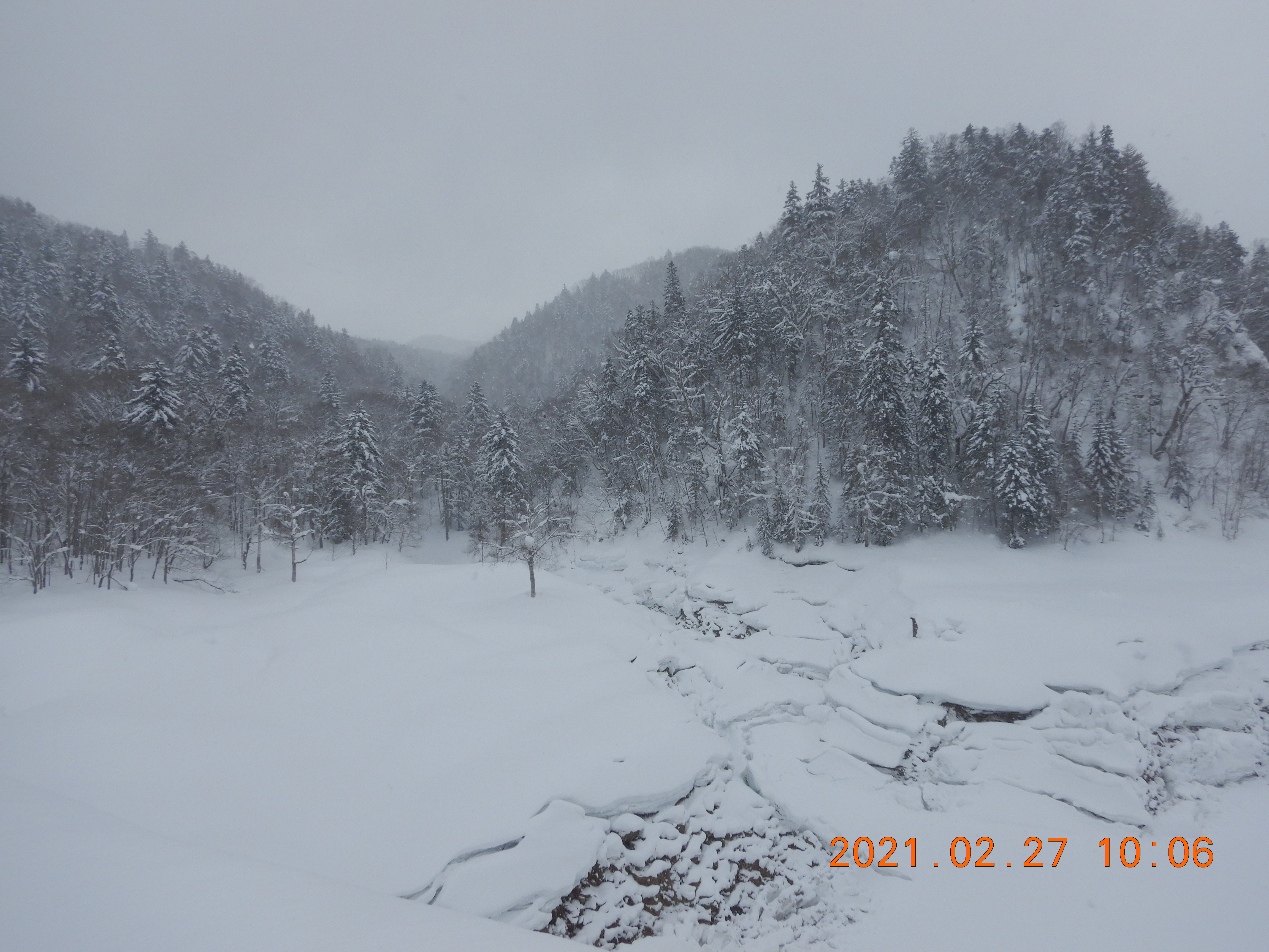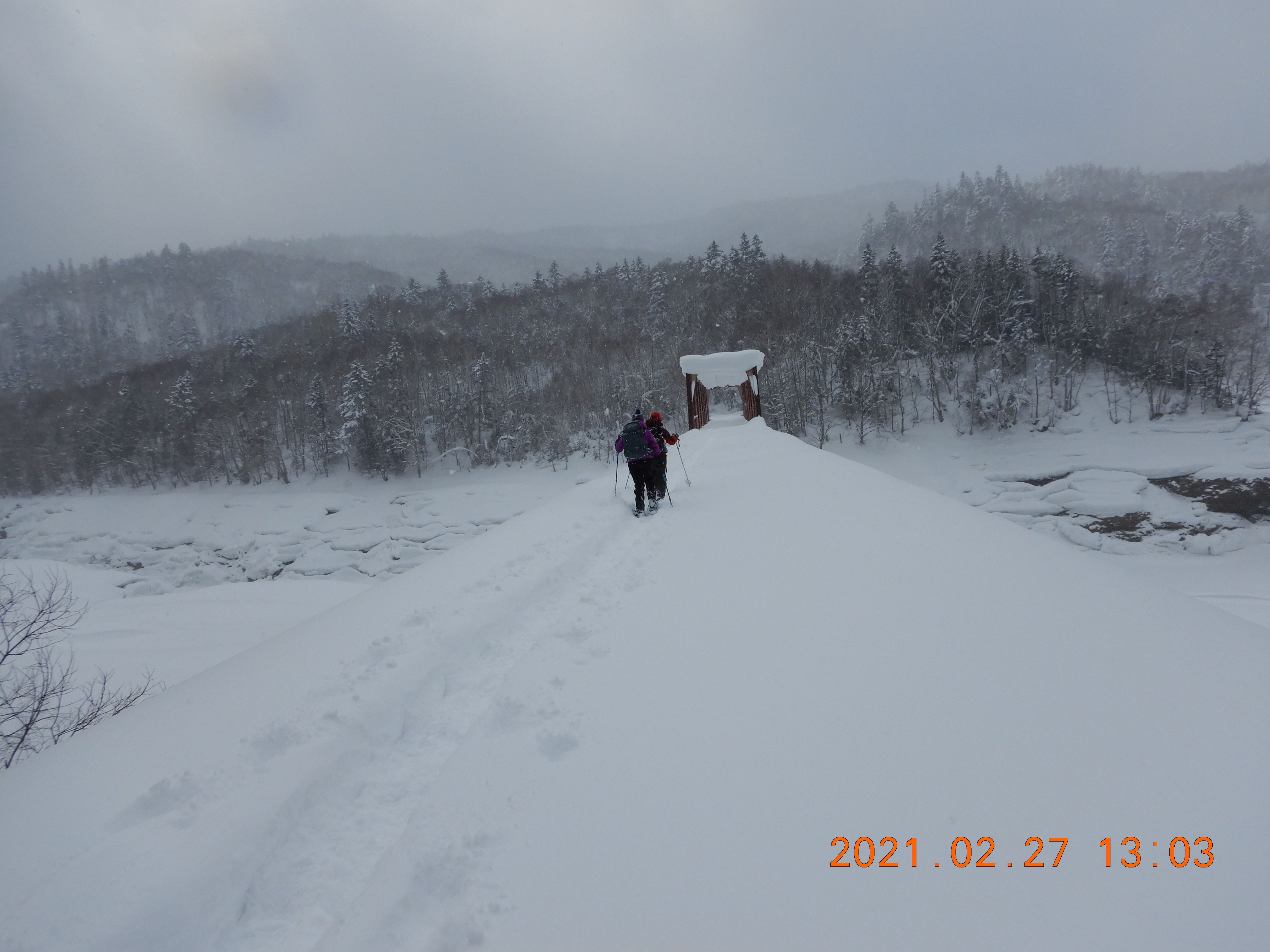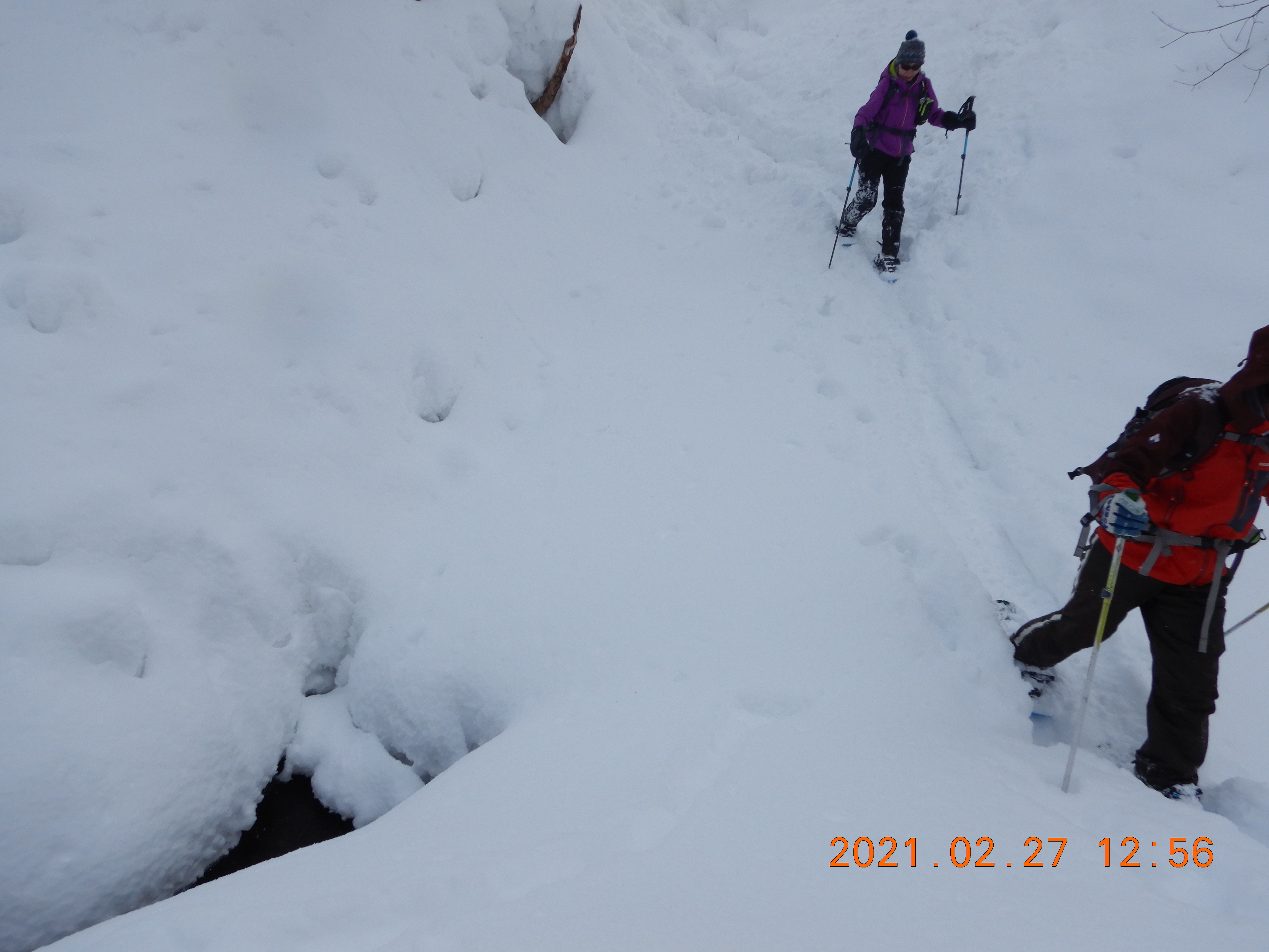下山は速いぞ 雪崩斜面を滑って SBで渡渉。