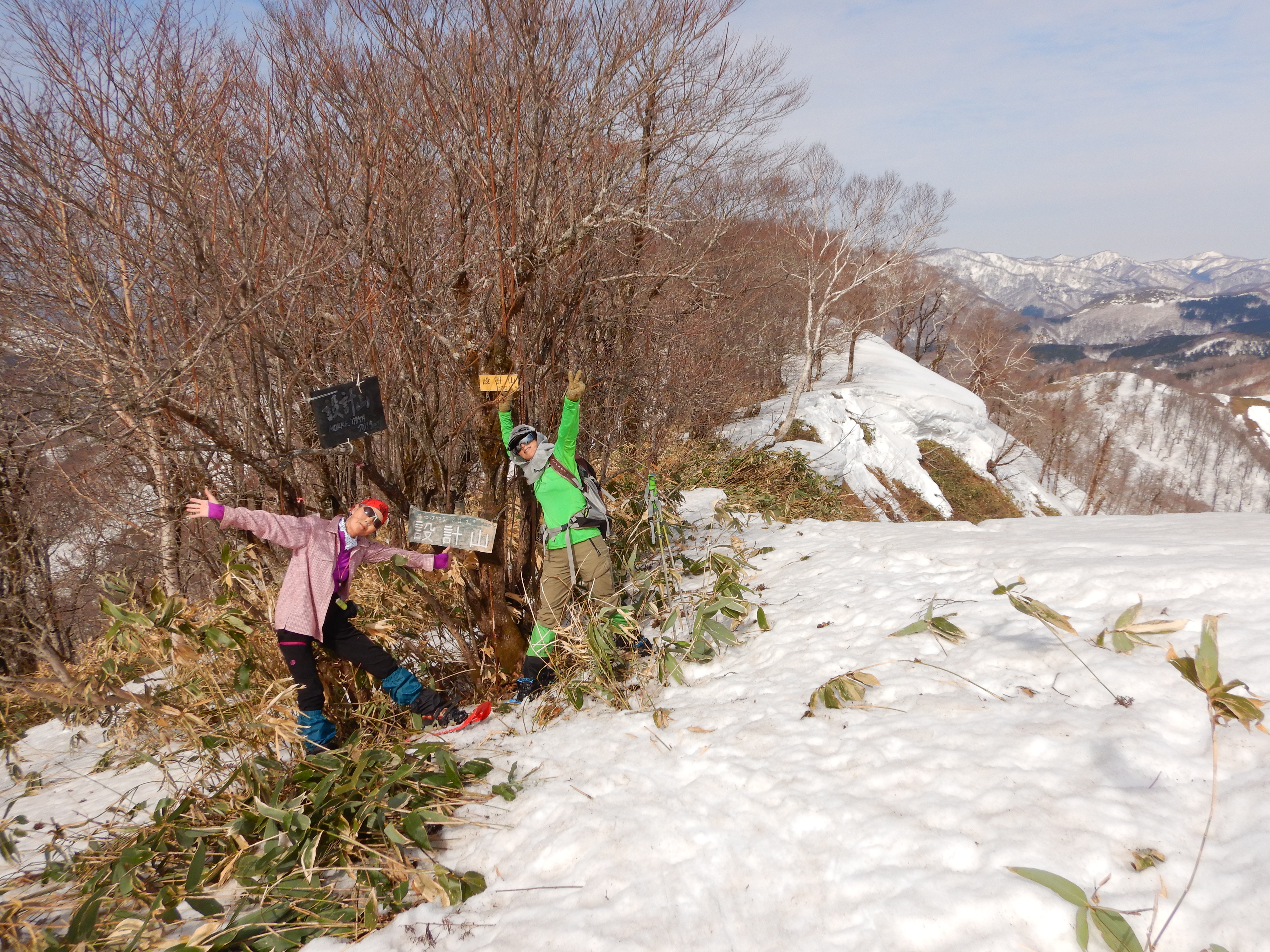 登山口から2時間弱・・・立派な看板が三つもある設計山(もっけやま)山頂に到着。
