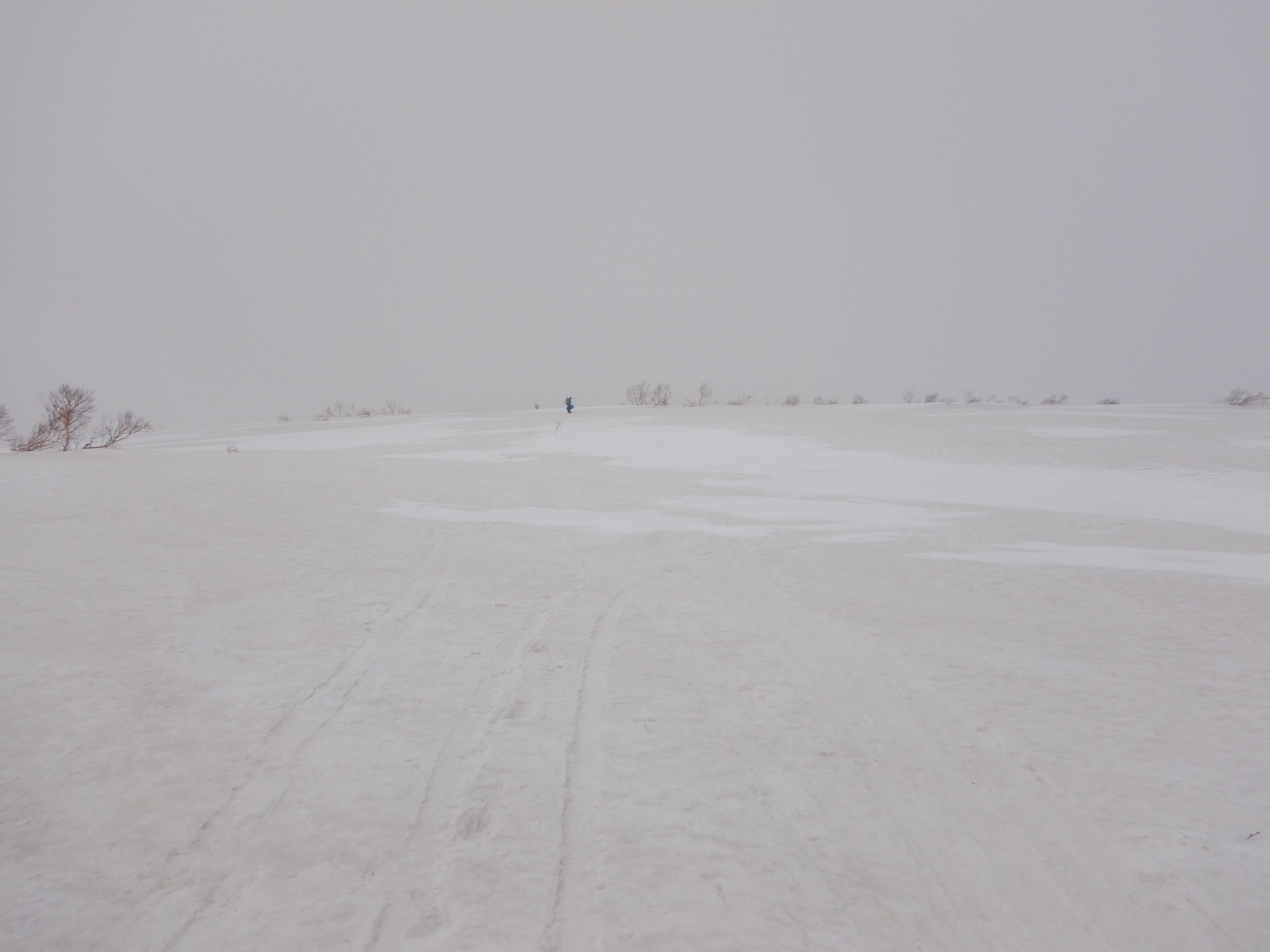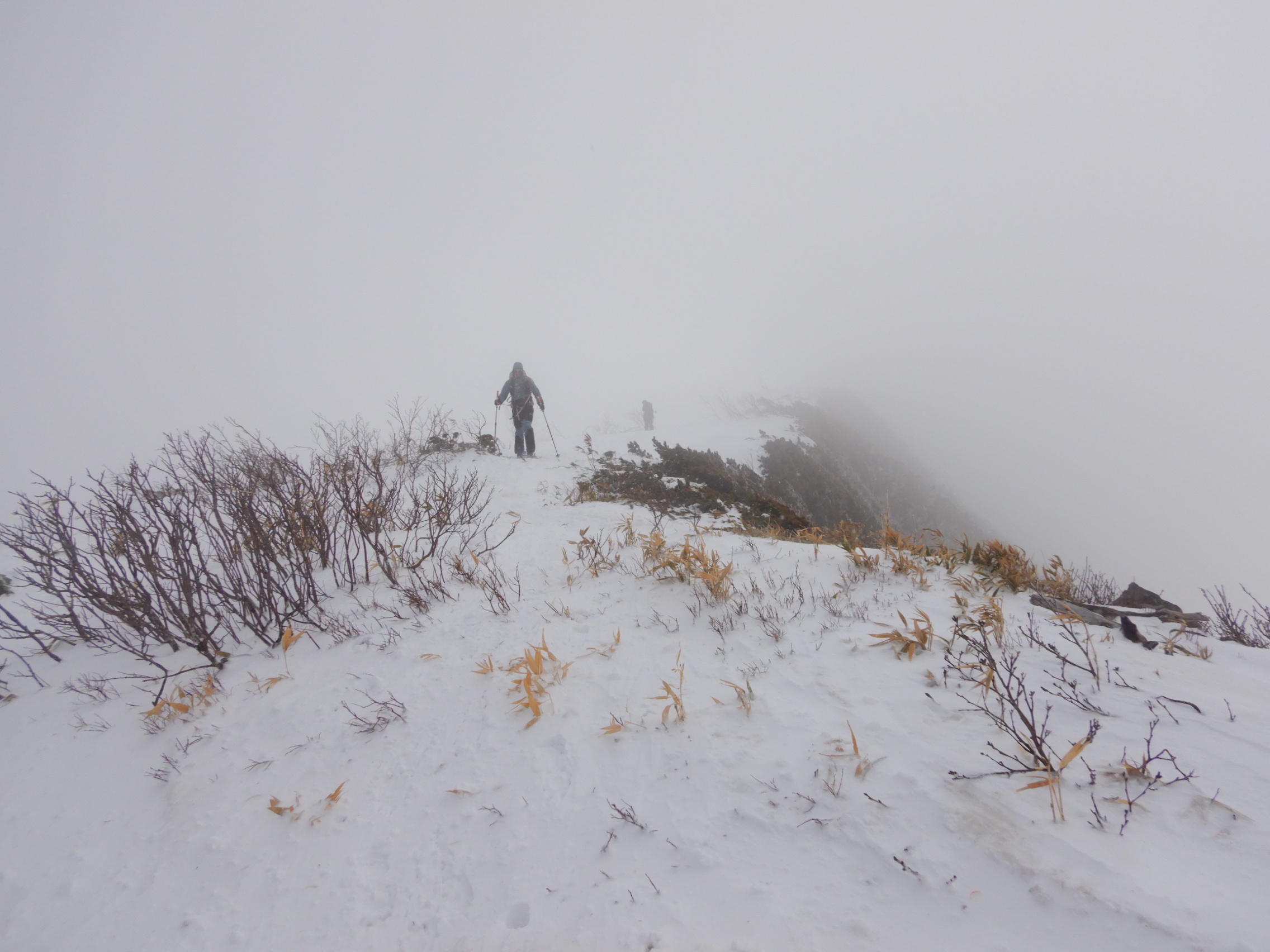 南西の風は15m以上 視界は50m程度 先行パーティーが見え隠れ。