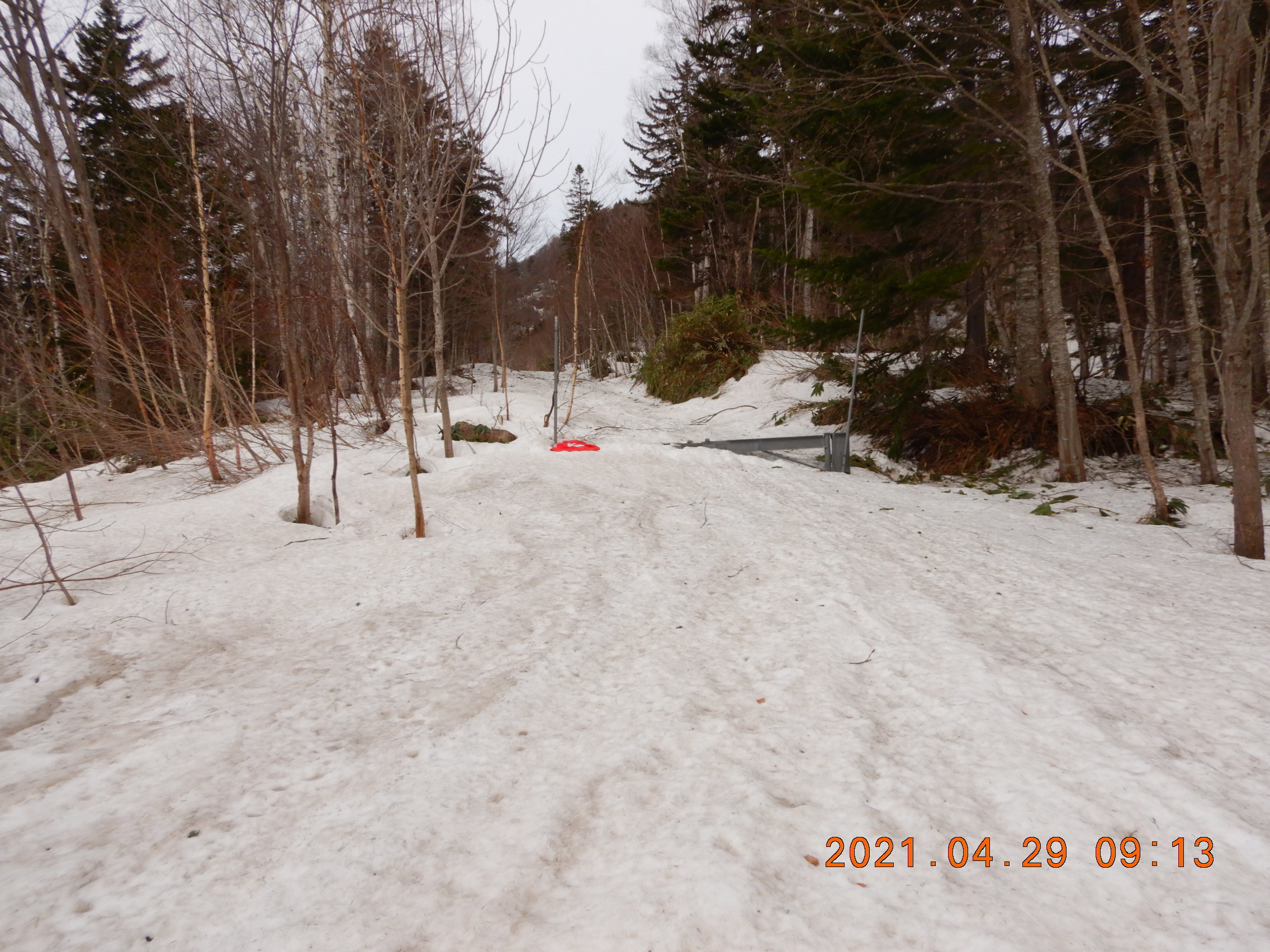 無意根の登山口から宝来沢林道を500m進んだら雪になりました。