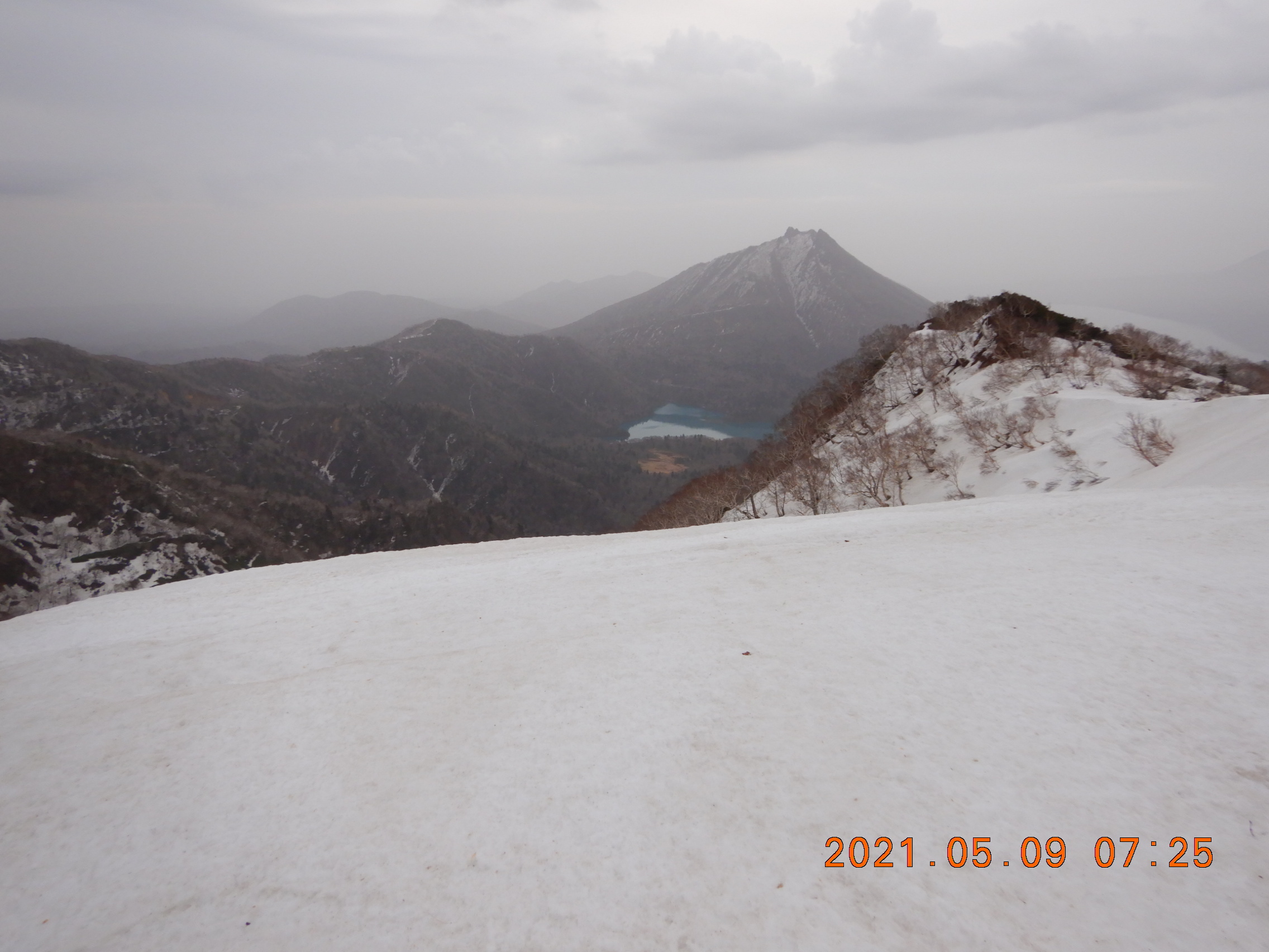 恵庭岳は水墨画の色調 オコタンぺ湖は鮮やかなターコイズブルー。