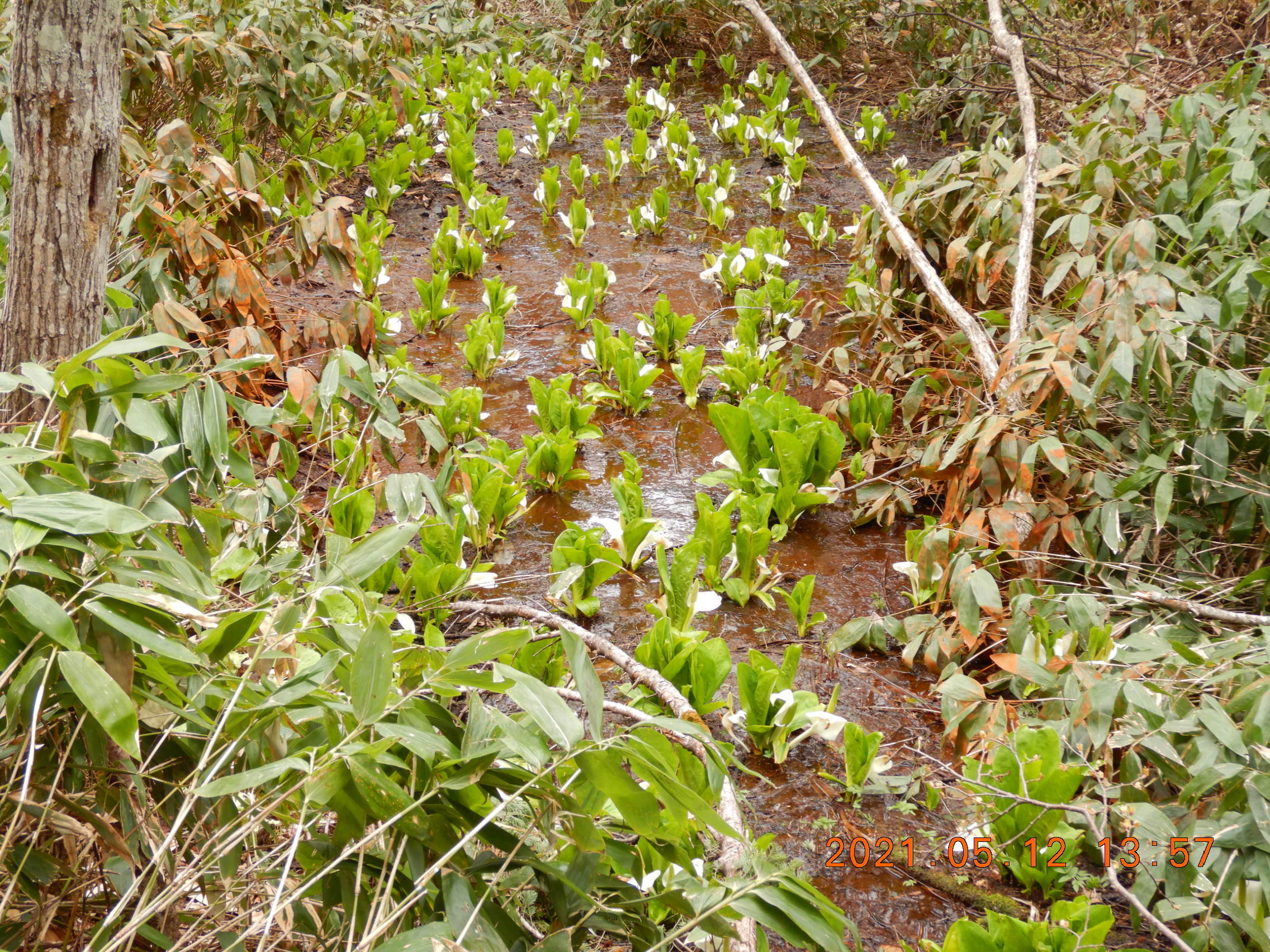 湿地にはサトイモ科の水芭蕉が群生していました。